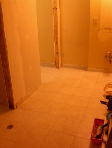 Second, the public powder room on the first floor, off the informal living room, is getting a make-over. This room originally was the chapter room (which is now the Exec Office upstairs on the senior hallway). It now has a tile floor (replacing the old linoleum). You can also see in the photo that the old metal stall dividers are being replaced with walls and doors.