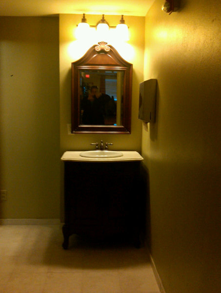 In this second photo you can see the new vanity, sink, mirror and lighting, and at least a hint of the new wall color, which is a soft green: