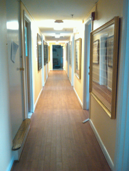 The first photo is taken from the senior side looking through the TV room (past the stairwell to the first floor) into the sophomore side and the mailroom at the end of the hall. The second photo is the sophomore side, looking down into the study room, and it shows the shoe-molding and thresholds installed.