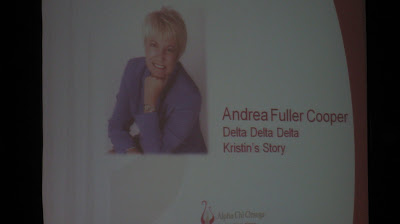 It was wonderful to see Florida State University alumna Andrea Fuller Cooper (Delta Delta Delta) honored with the Alpha Chi Omega Vision Award. The Vision Award goes to a non-Alpha Chi Omega who is making a difference in the Greek Community. Through her years of presenting Kristin’s Story on campuses and in communities, Andrea has made a difference for students, their friends, and their families as she shares the story of her Alpha Chi Omega daughter, Kristin, the acquaintance rape she endured, and the depression and suicide that followed. In spring 2000, when Andrea told Kristin’s Story for the first time, she did so at her alma mater, Florida State University. Beta Eta hosted her (with Tri-Delt) and she’s remained close to our hearts since then.