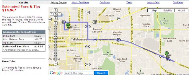 The hotel is situated on Apalachee Parkway, approximately 4 miles from the Beta Eta House. We have estimated a taxi fare to be approximately $15 one way between the Alpha Chi house and the Hotel.