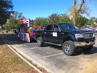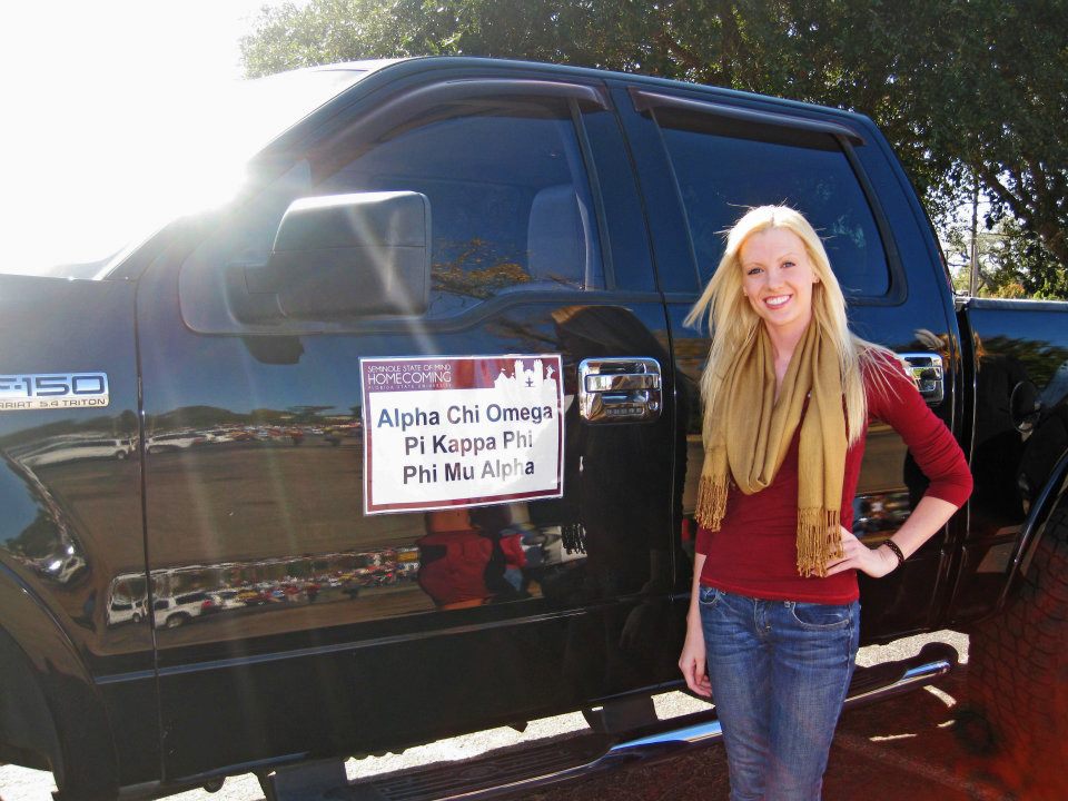 Alpha Chi Omega collegian Morgan Skaggs uses her truck to pull the float