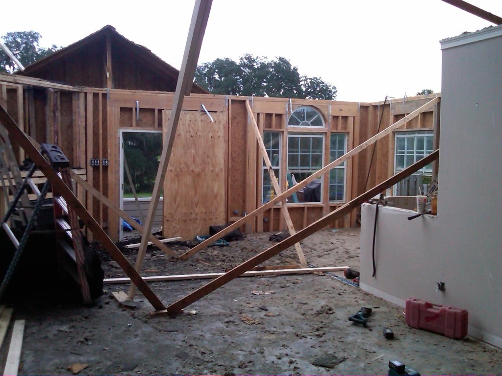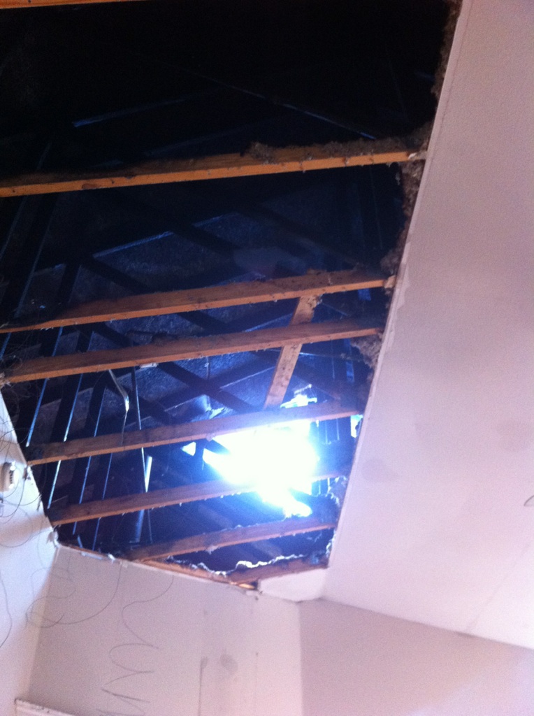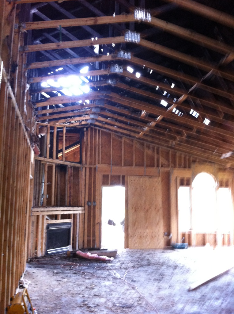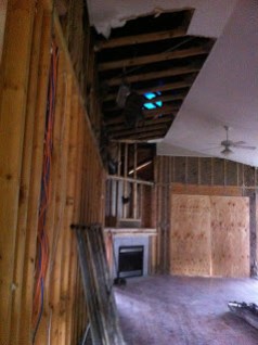 The entire family home, had to be gutted,  taking the house down to the studs in parts. In fact they even took off what was left of the roof, and put on an entire new roof. Below are photos of the roof removal and such from July. You can also see the state of the interior at the time.