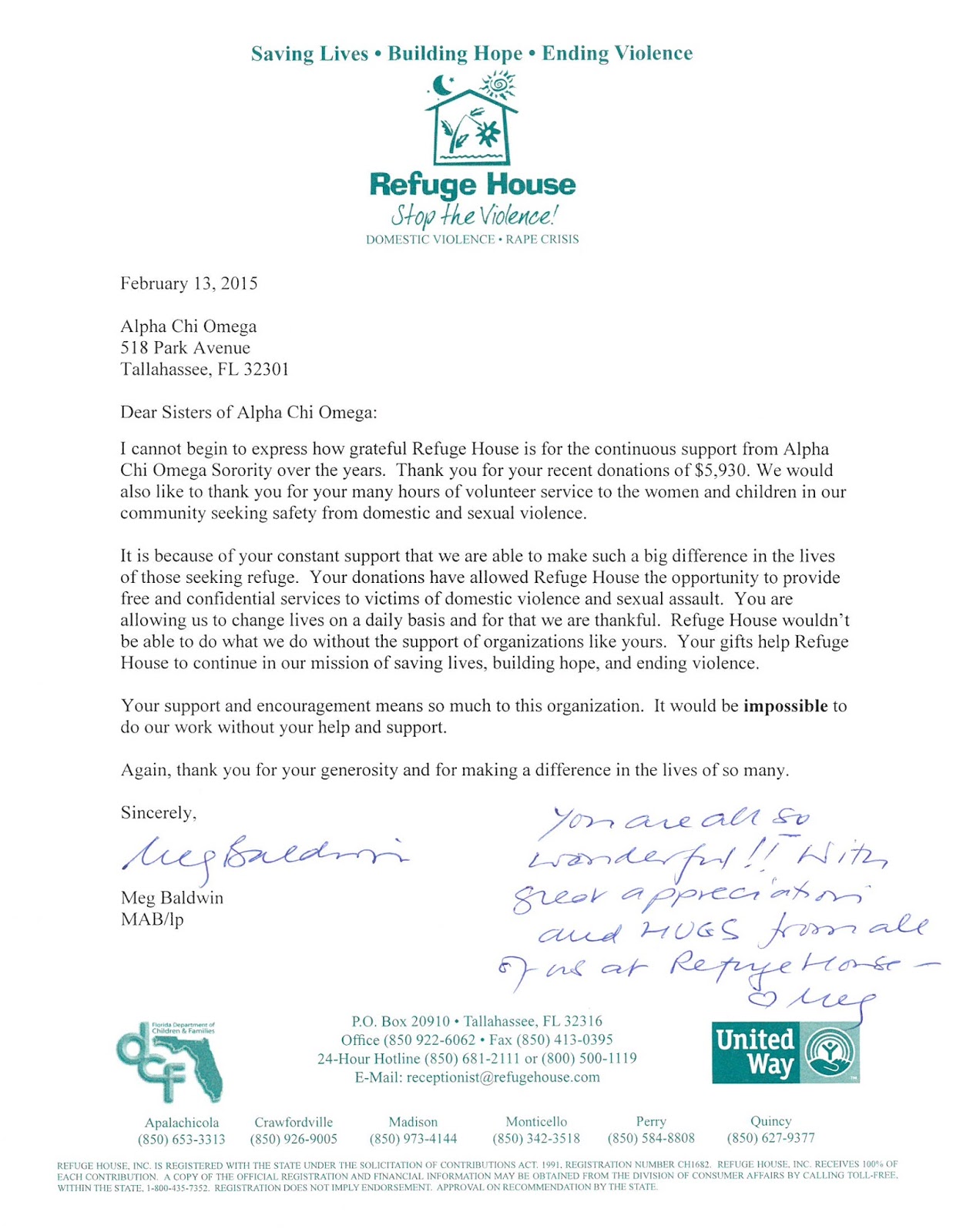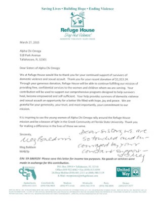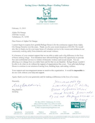 We appreciate the relationship we have with Refuge House. We help them monetarily through fundraising events like #PizzaPiewithAlphaChi and #DonutsforDVA. Sisters lend helping hands physically as well, by volunteering when needs arise such as painting or helping with Halloween carnivals. Refuge House holds trainings for our sisters, allowing AXOs to understand more about domestic violence awareness, and how we can help and advocate for the cause.