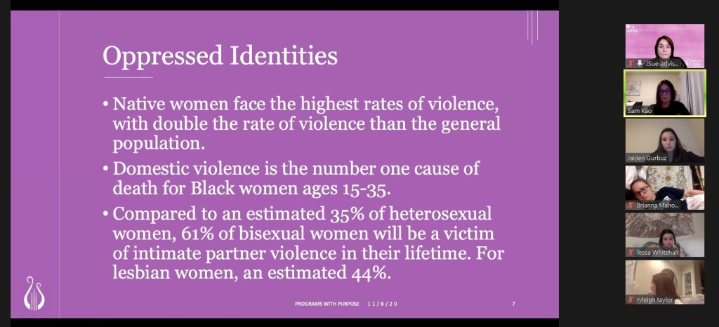 Again we want to give props to our SISTERS who were engaged and interested in this challenging, but important topic! And, of course, our bold facilitators who led us through the exercise: Sam Kao (senior, DVA representative and Refuge House liaison), Lila Dudley, McKenzie Clark, Jaiden Gurbuz, Steph Flegal and Tia Kearney. We love y’all all!