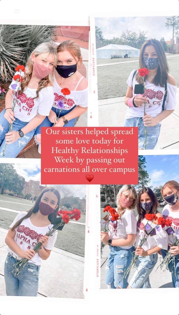 The ladies of FSU Alpha Chi Omega celebrated Healthy Relationships Week, #AXOHealthyLove, passing out red carnations to students, staff and faculty on campus!! The Random Act of Kindness (RAOK) was well received by all. The event was organized by Panhellenic Delegate Ally Columbus.