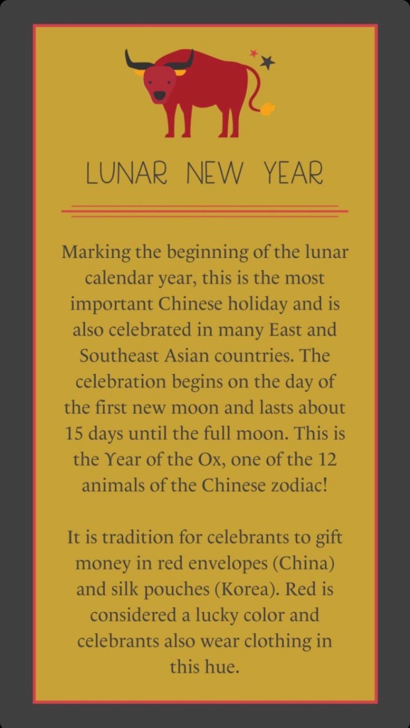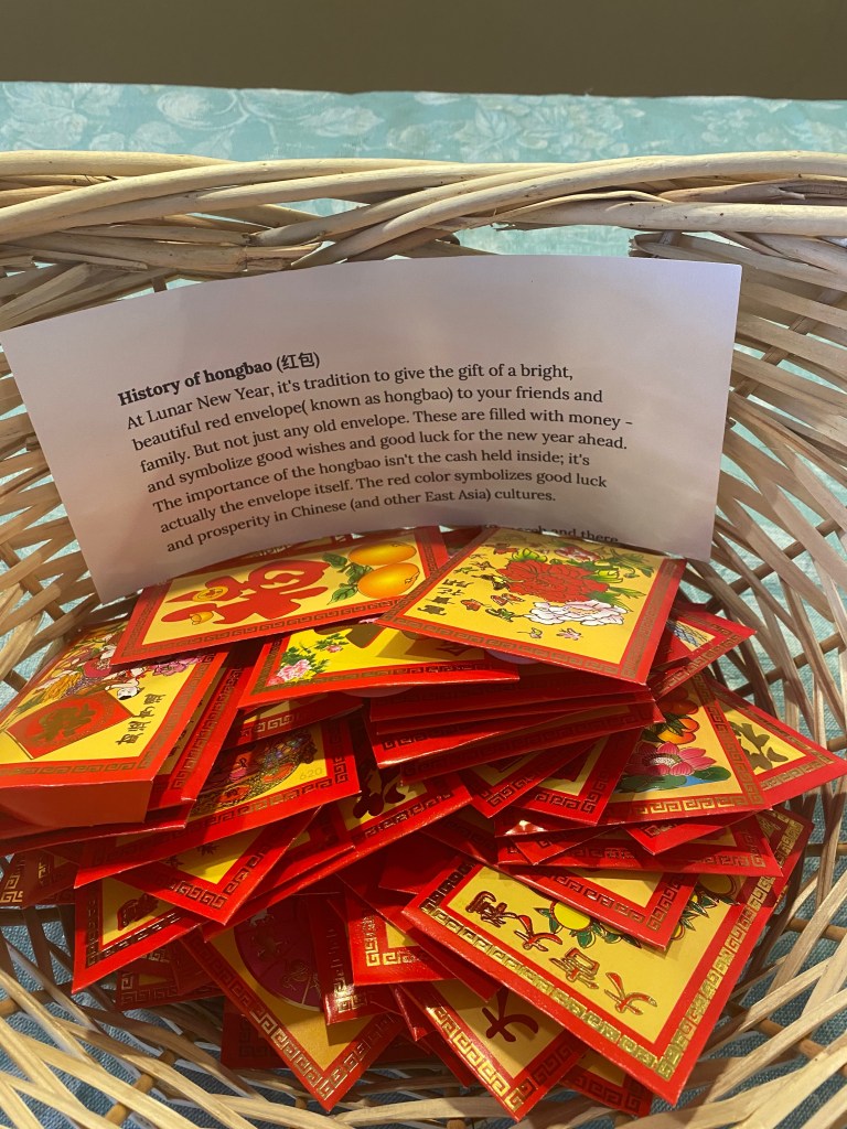 The chapter celebrated Lunar New Year on Friday February 12th! Lunar new year is celebrated on the first day of the first month of the Chinese Calendar. It is also called the spring festival and is the most important of the traditional Chinese Holidays. The Chapters VP Diversity, Equity and Inclusion, Alara worked with the chapters’ chefs to elevate the planned meal for the day. Alara also worked to incorporate traditional items to celebrate the special day. Before/after each sister sat down tables were cleaned and placemats were set out at each space that explained the Chinese Zodiac. As members went through the buffet line (were they were individually served by severs per COVID-19 guidelines) they had the option to select a traditional red envelope. It is traditional to give the gift of the red envelope, known as hongbao to your friends and family. But not just any envelope. They are traditionally filled with money and symbolize good wishes and good luck for the new year ahead. The importance of hongbao isn’t the cash held inside; it is actually the envelope itself. The red color symbolizes good luck and prosperity. Instead of cash, inside each of the envelopes the ladies at Alpha Chi Omega received were either a slip directing members to select a piece of Alpha Chi Omega merchandise or a Chinese proverb. (note we have a select few that did have a $5 or $10 bill)