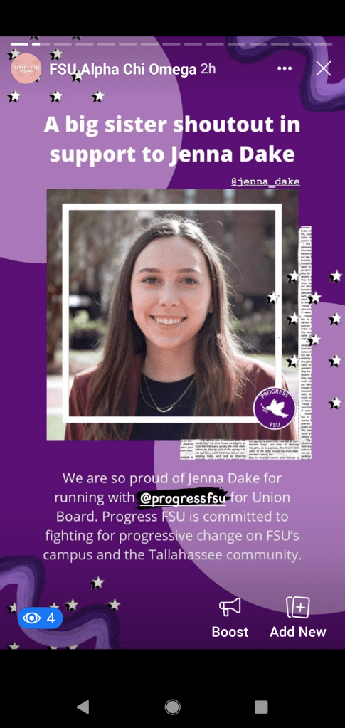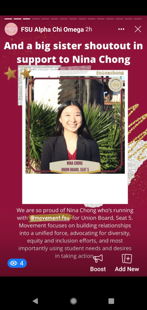 Junior Jenna Dake and Freshman Nina Chong are both on the Ballot for Union Board. Thank you for seeking to improve FSU for your fellow sisters and students.