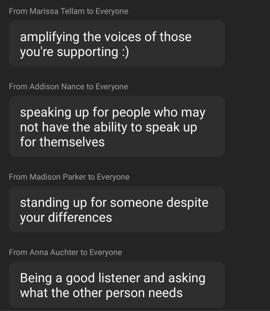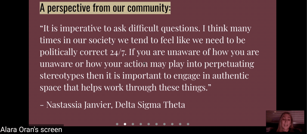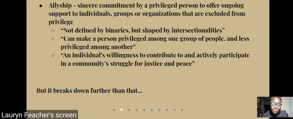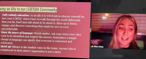 The speakers covered an impressive spread of topics helping us learn and understand: Being an Ally for a friend with autism/a sister coming out to her family/ a cousin with a medical condition/Black Lives Matter Marches; Allyship; Being an Active Ally; Performative vs. Active Allyship; LGBTQIA Allyship and Period Poverty and discussing our focus for Hera Day (collecting tampons and pads to assist Amaya and her Girl Flo project!)