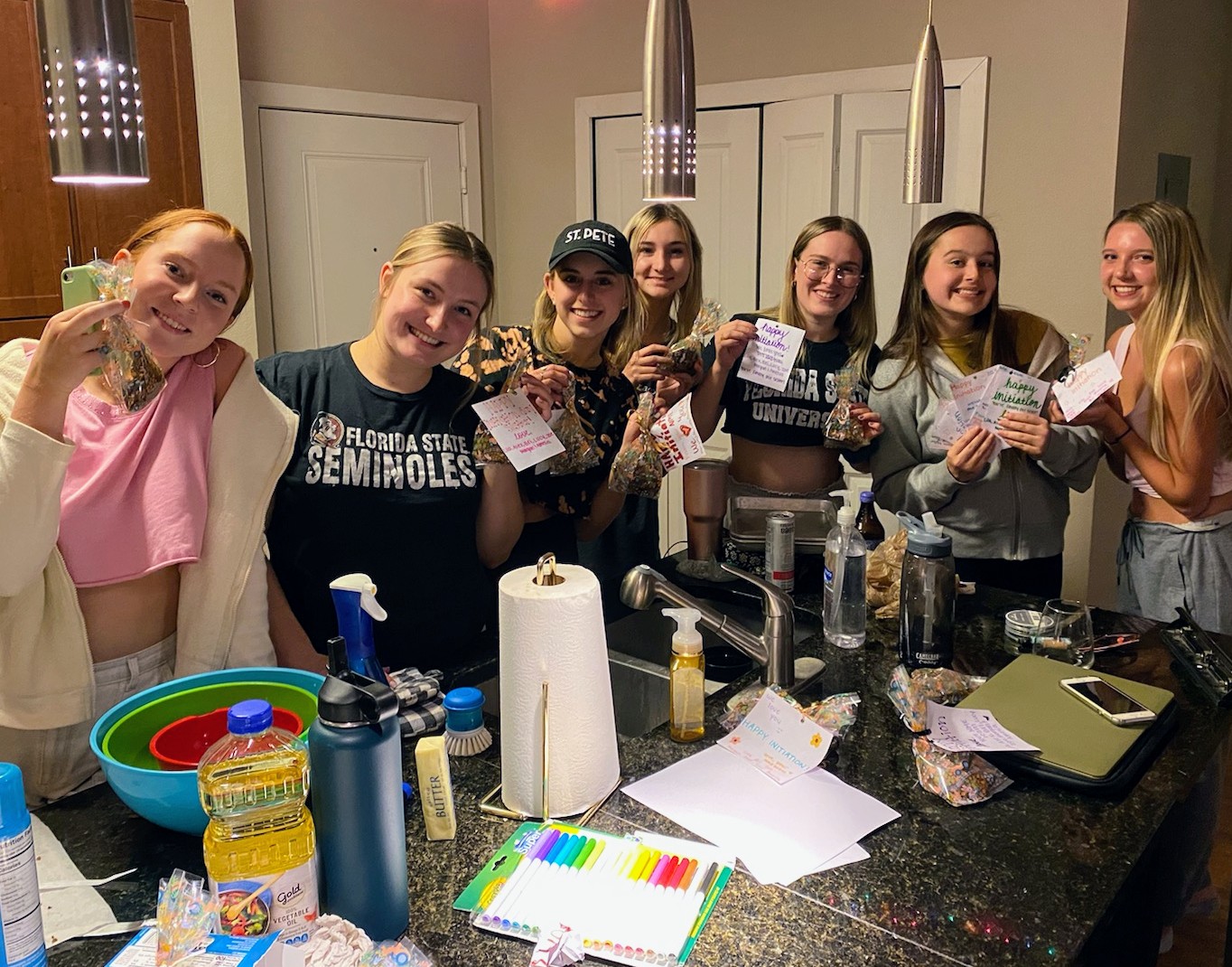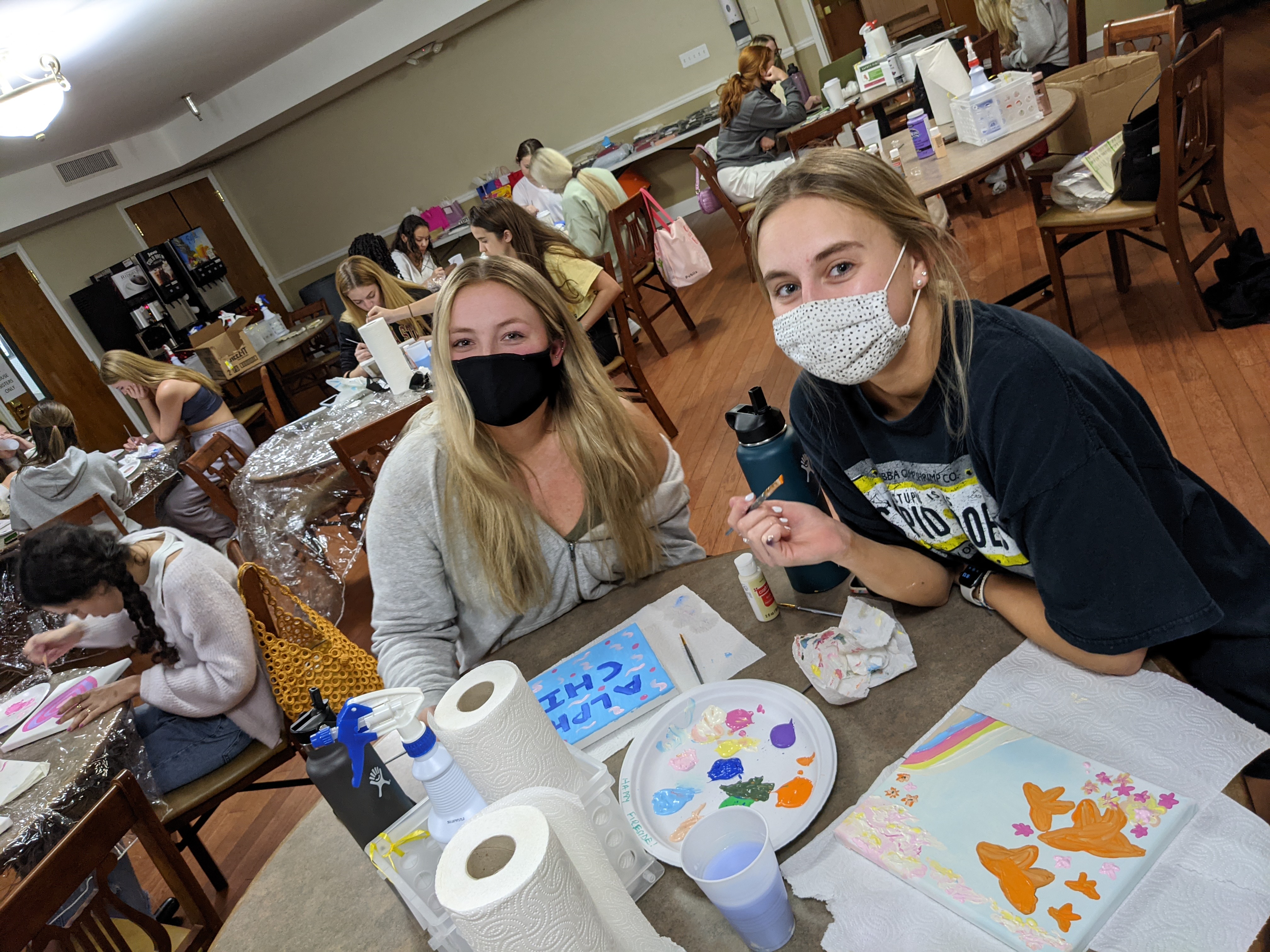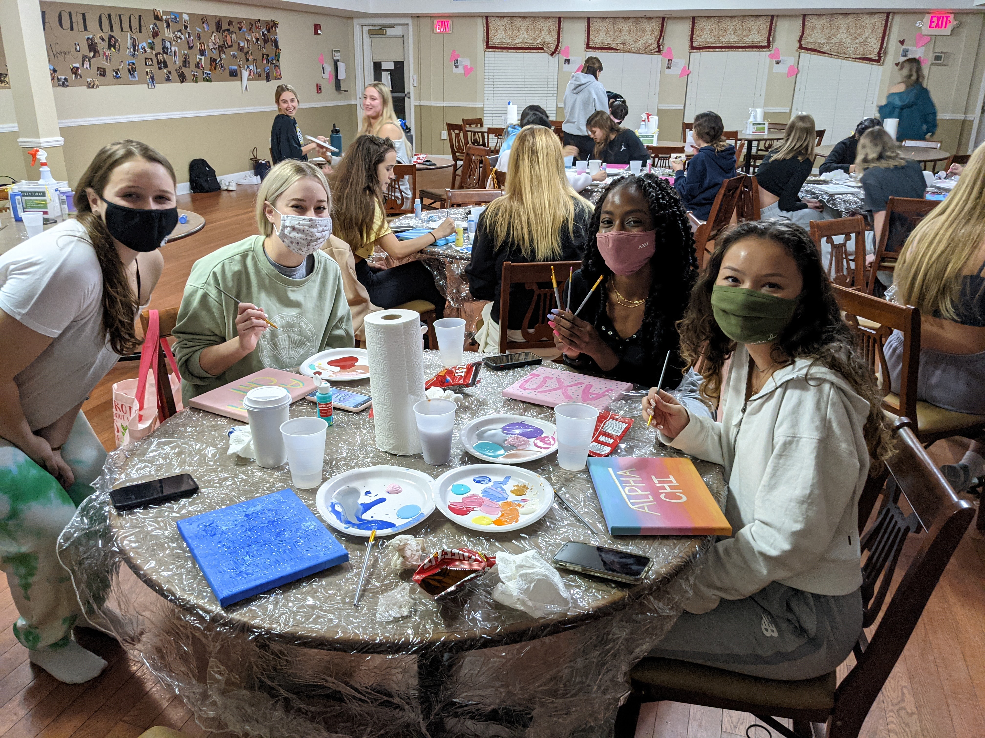 The NME committee set their minds to make the week of Initiation special for the Spring new members and have fun and connect within the committee. The super team of seven enjoyed baking cookies (and getting to know each other better) for the member class to enjoy at … CANVAS Paint Night! That’s right. The NME fashioned the dining room into an art studio for some fine art fun (see how we ties that into Alpha Chi history? 😘)