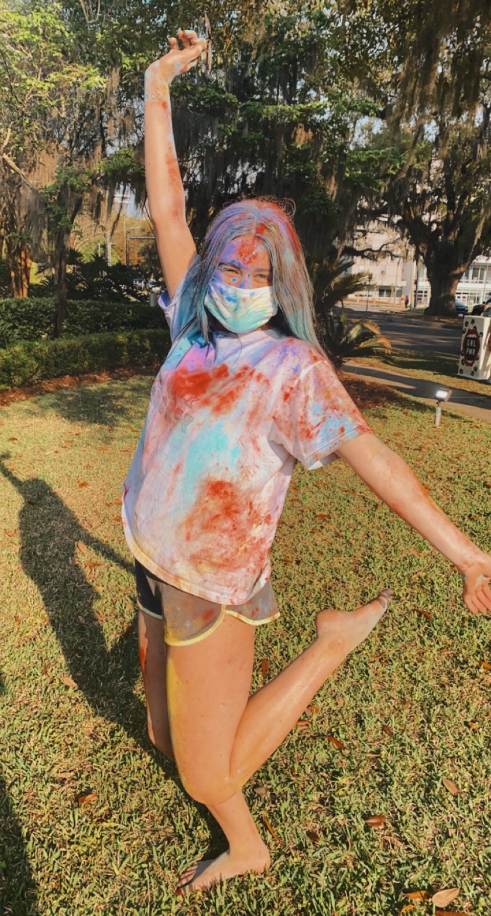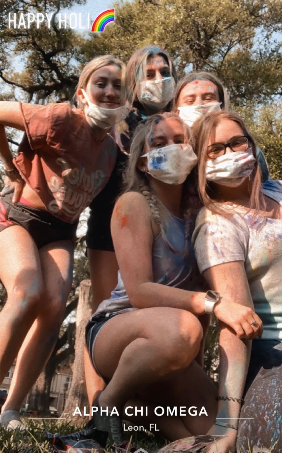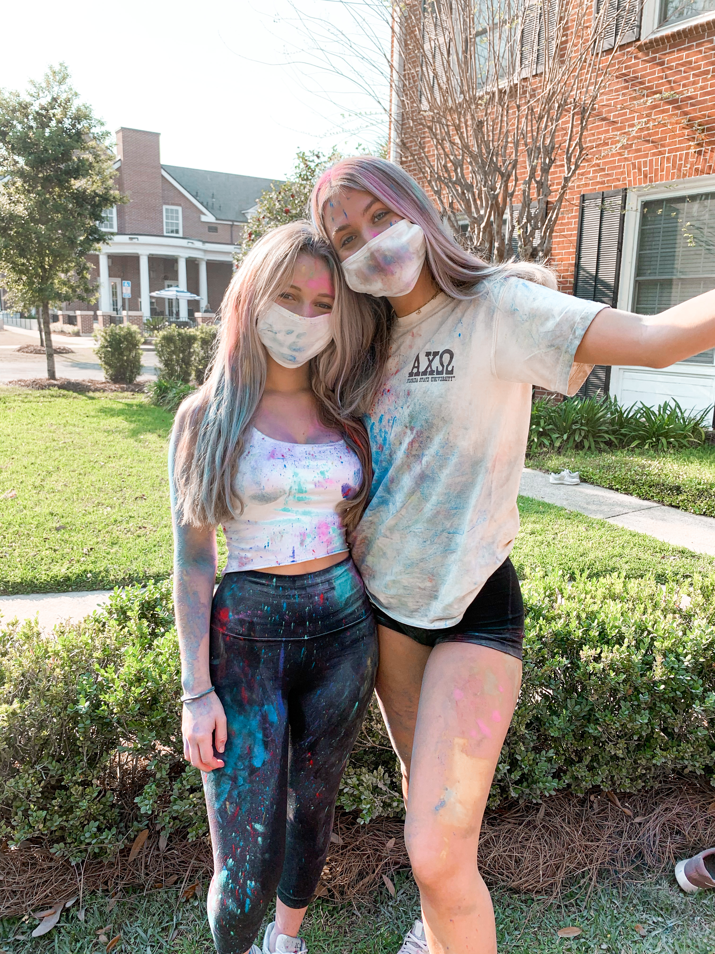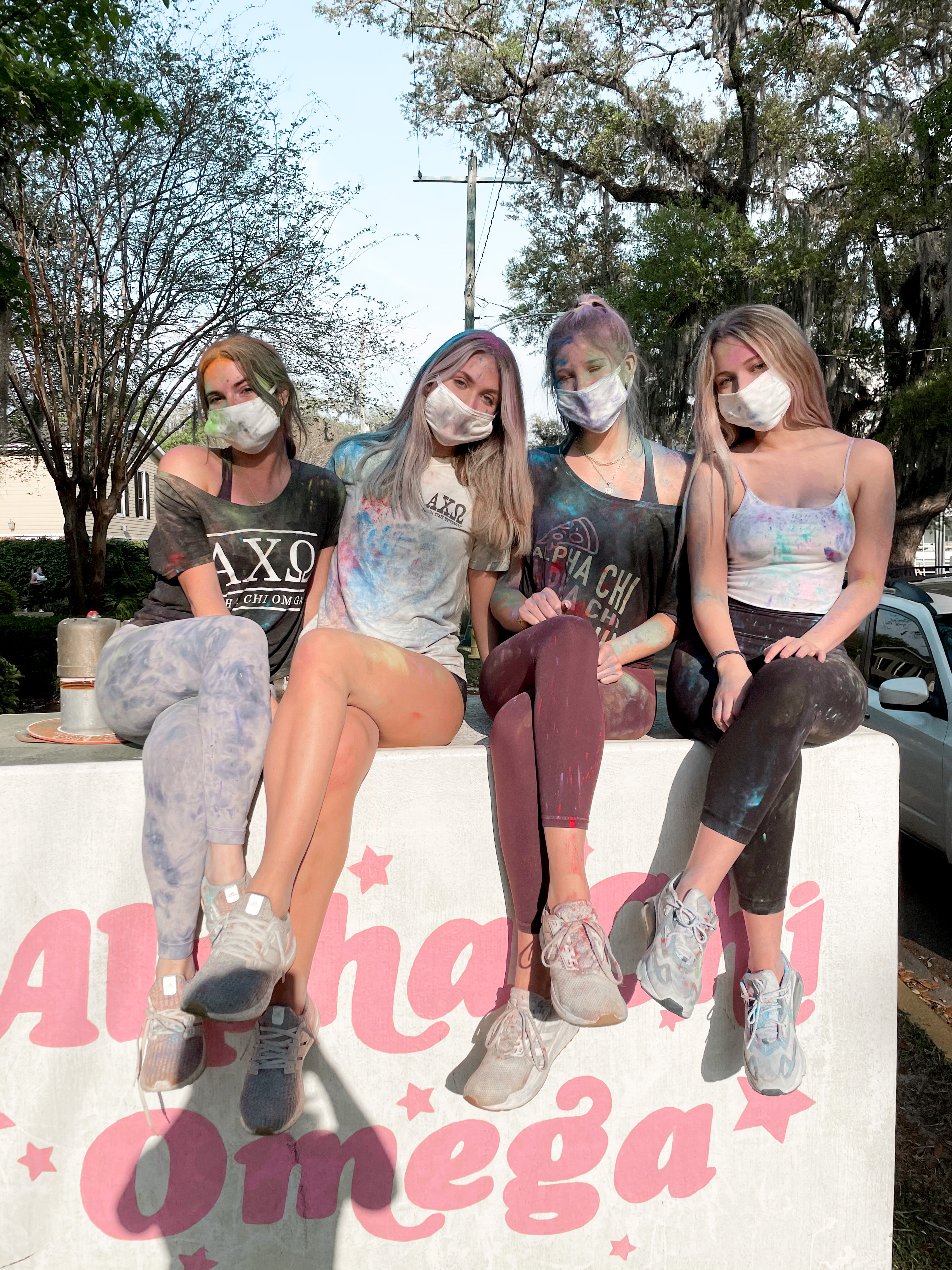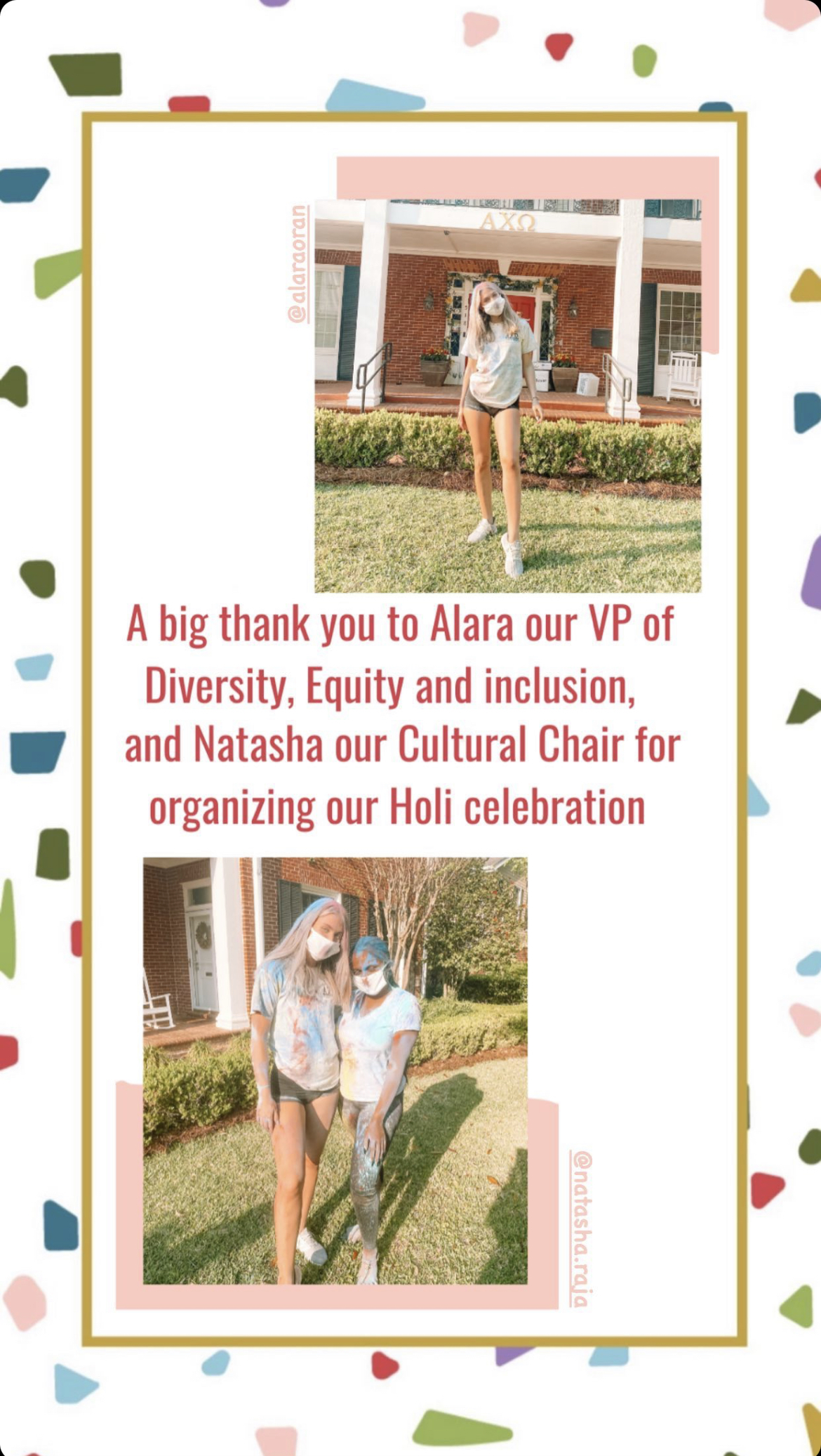 This week the ladies of Alpha Chi hosted a Holi celebration. Known as the festival of colors – the celebration consisted of the VP Diversity, Equity and Inclusion, Alara & Cultural Chair, Natasha sharing information about the Holiday and the significance of the colors – followed by sisters throwing colored powder!