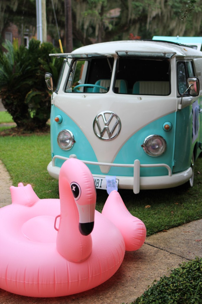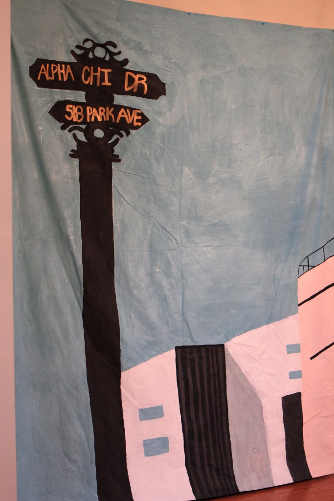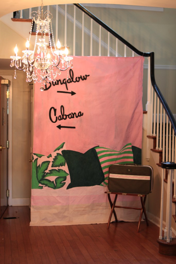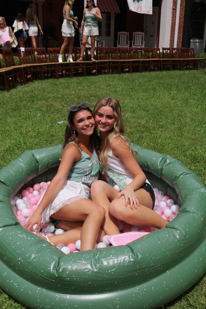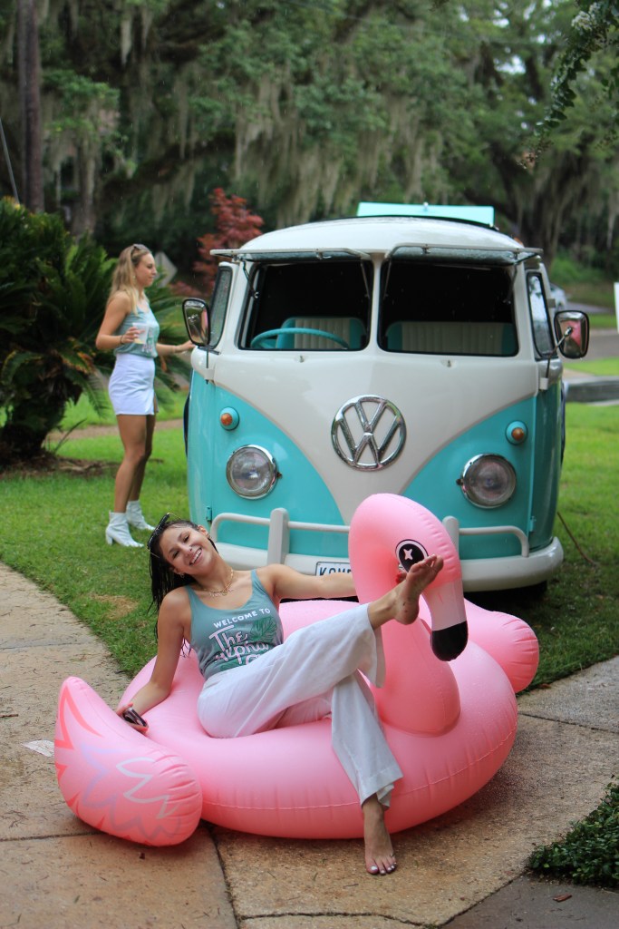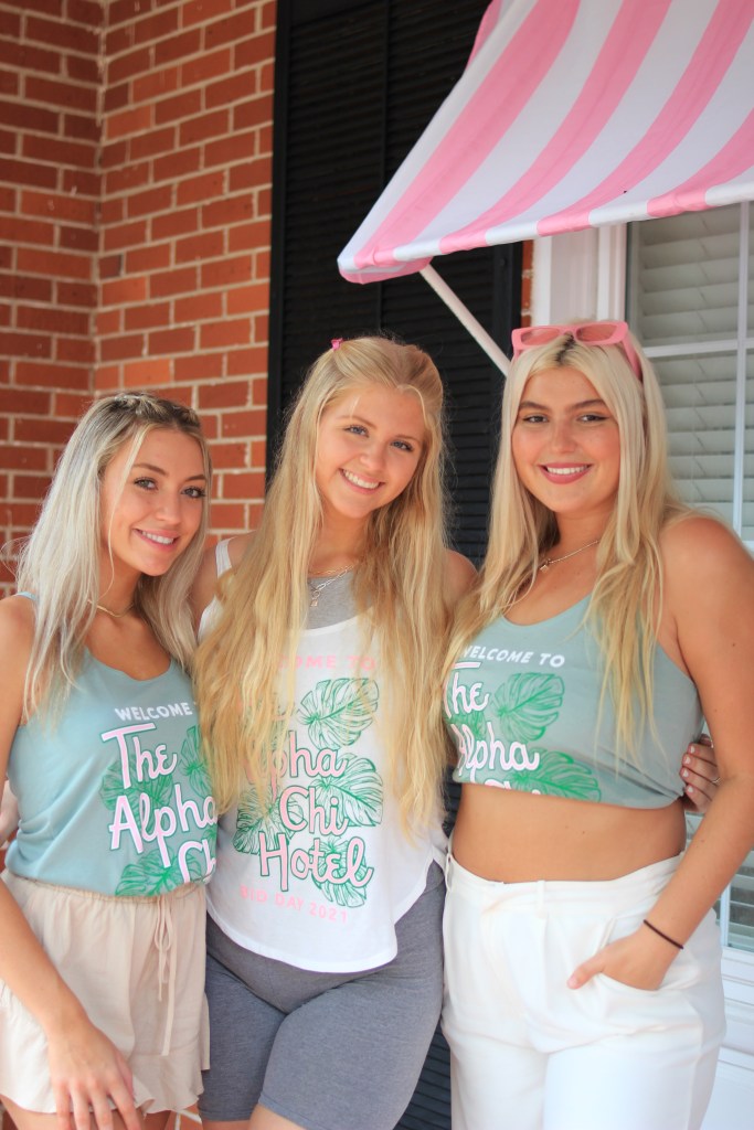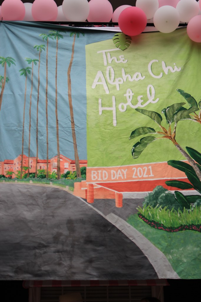 VP NM Education Lila, Bid day Chair Zoe and the NM Education committee- organized a bid day to remember. Taking a twist on Beverly Hills hotel – 518 was decorated with custom banners, faux awnings, a Kombucha truck, painted letters etc. for the occasion.