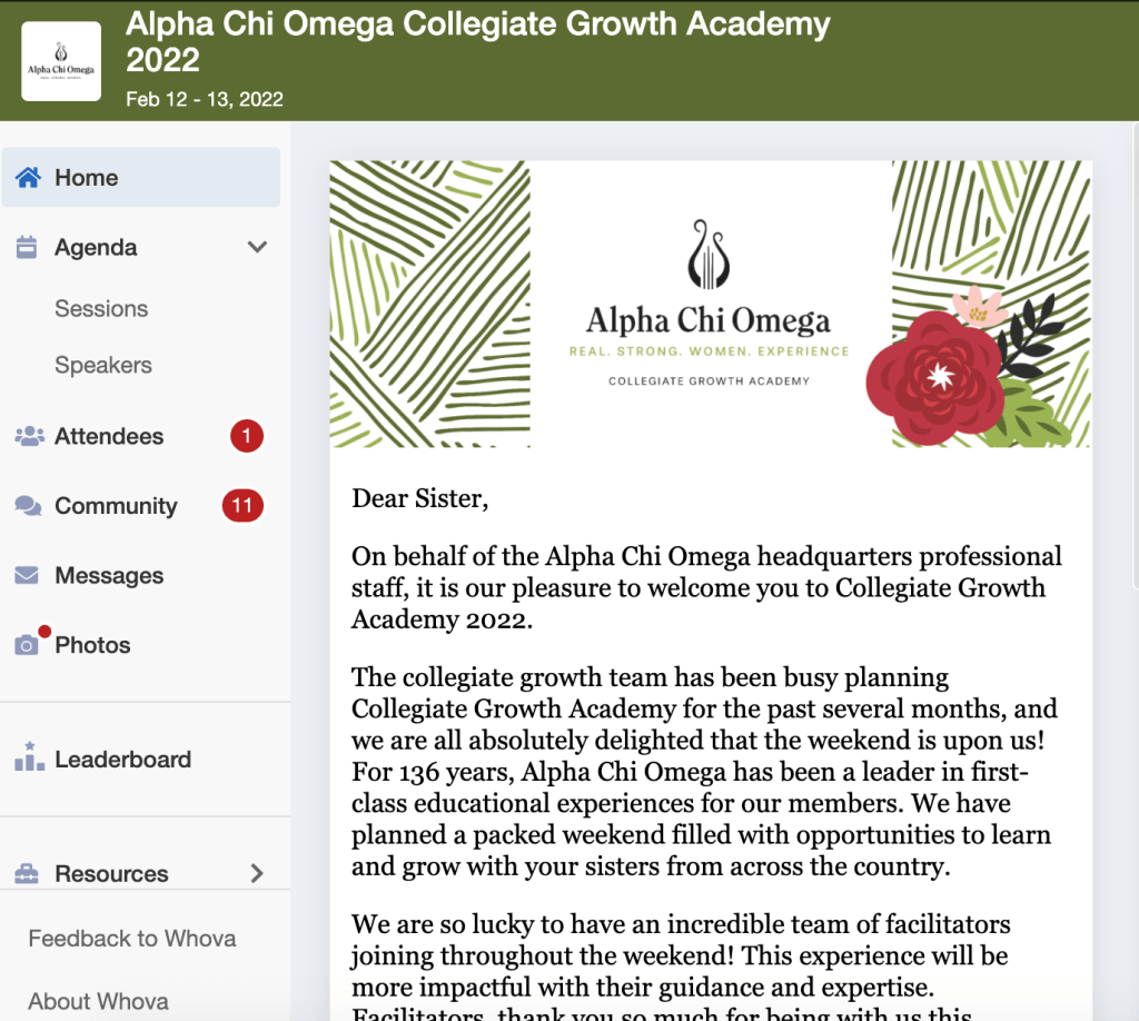 While Virtual – Collegiate Growth Academy was an engaging experience and we are so thankful for the experience, the connections, and the takeaways… Alpha Chi Omega utilized the Whova app to manage the conference and it was wonderful! We were able to see our agenda, share photos, ask questions, download contact info, etc!