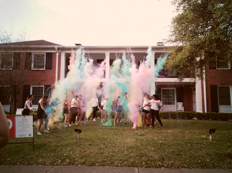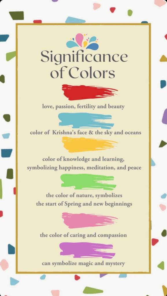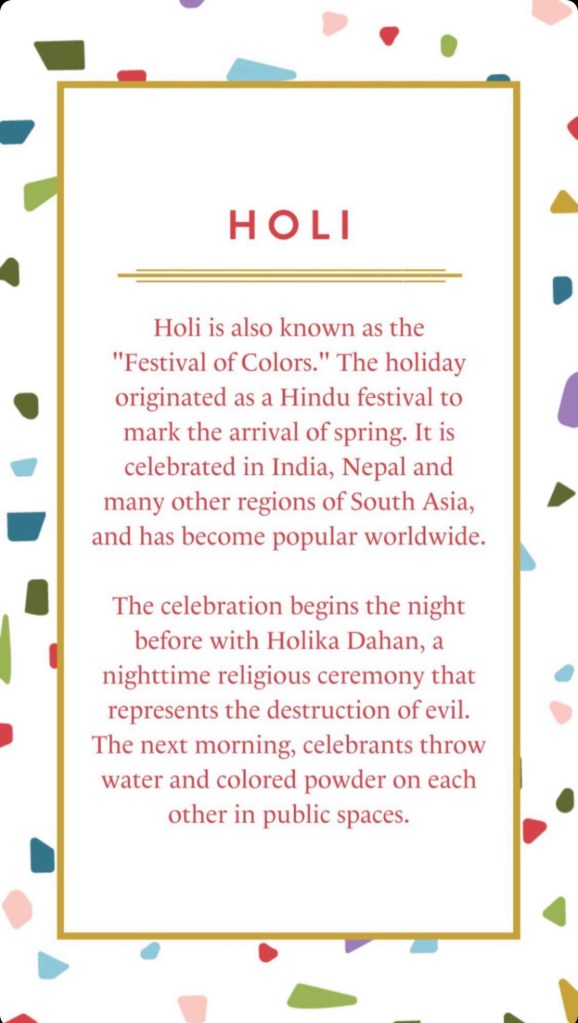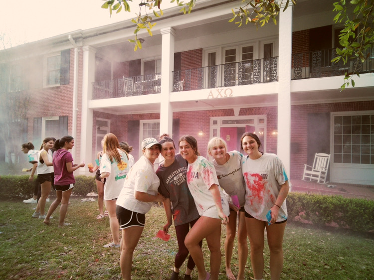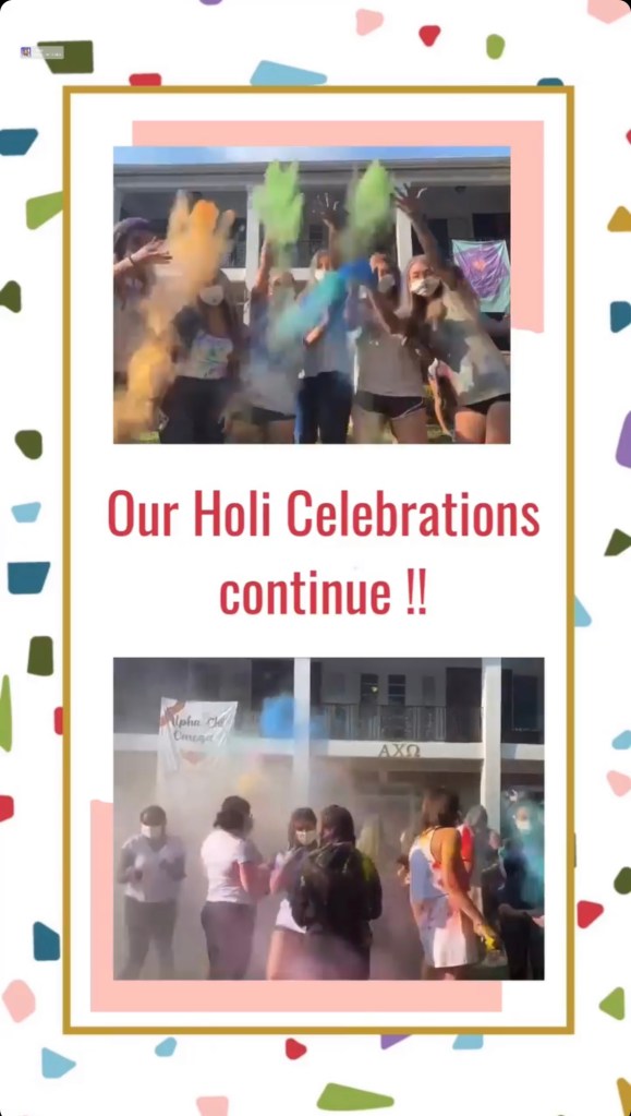 Alpha Chi Omega Celebrates Holi. Holi is an ancient Hindu tradition and also one of the most popular festivals in Hinduism. It celebrates the eternal and divine love of Radha Krishna. The day also signifies the triumph of good over evil, as it commemorates the victory of Lord Vishnu as Narasimha Narayana over Hiranyakashipu. The chapter celebrated with a traditional colored powder throw, followed by traditional Holi meal