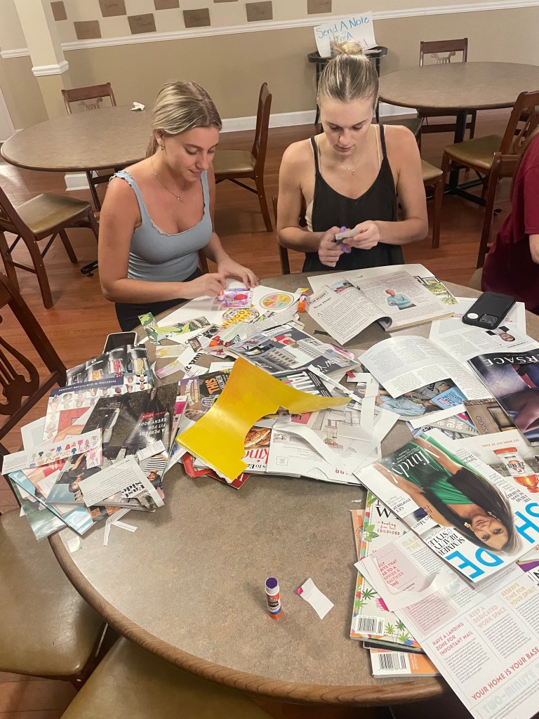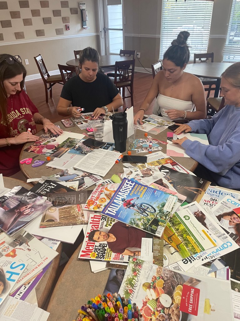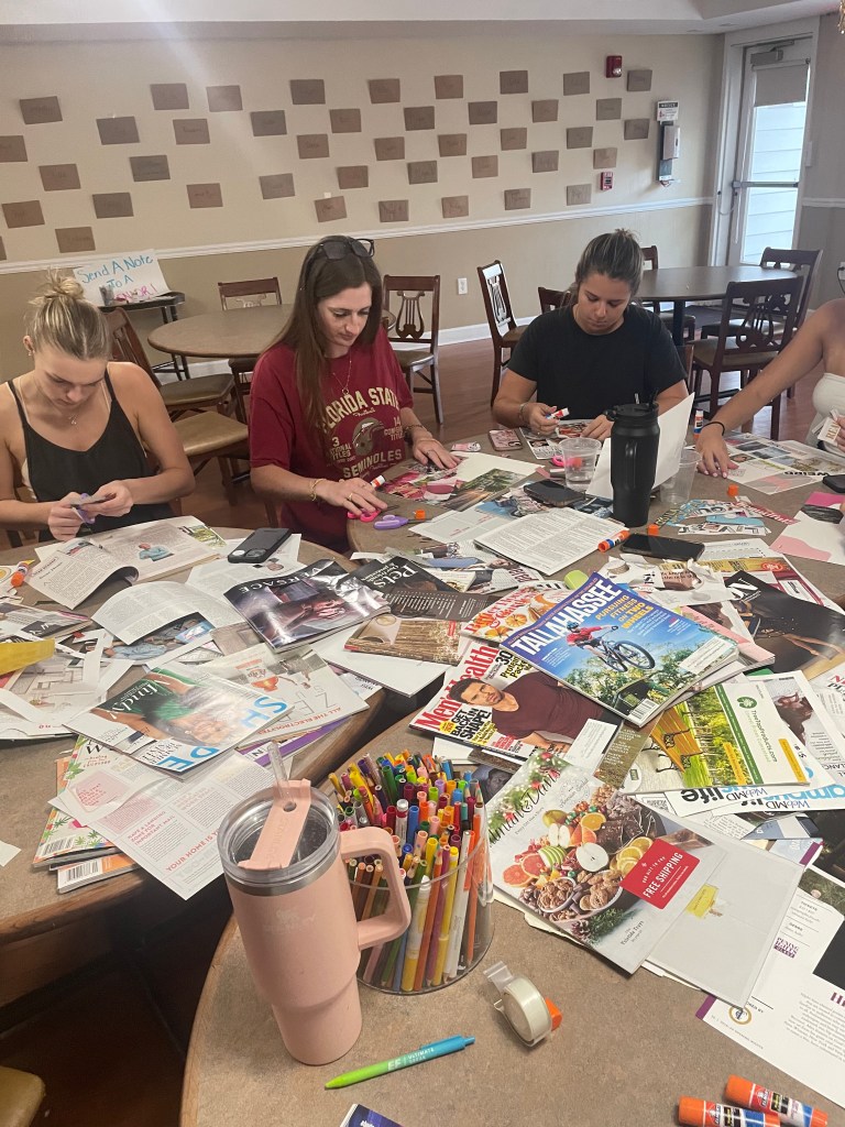 There great news is there are really no rules when it comes to vision boards, since it’s about crafting something that will inspire you to realize your dreams and goals on a daily basis. Some vision boards hone in on a singular idea, while others look at the bigger picture of what you might want the future to look like. This past week VP DEI Anna partnered with the Florida State University CHAW (Collegiate Health and Wellness office) to host the event for members of the chapter. Members of the CHAW team came with magazines, poster boards, etc. And Alpha Chi brought markers, tape, and other supplies. The event was a fun fun arts and crafts project that allowed members to see what their goals would look like once they achieve them. Each member walked away from the event with a unique board and we have confidence each member will be successful in seeking the heights!