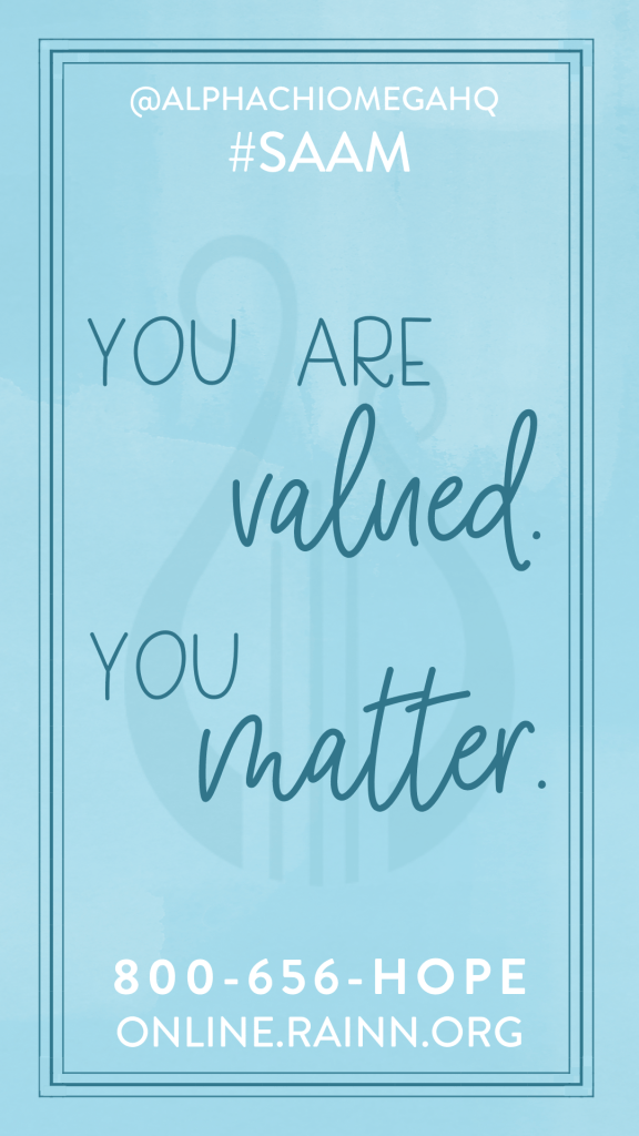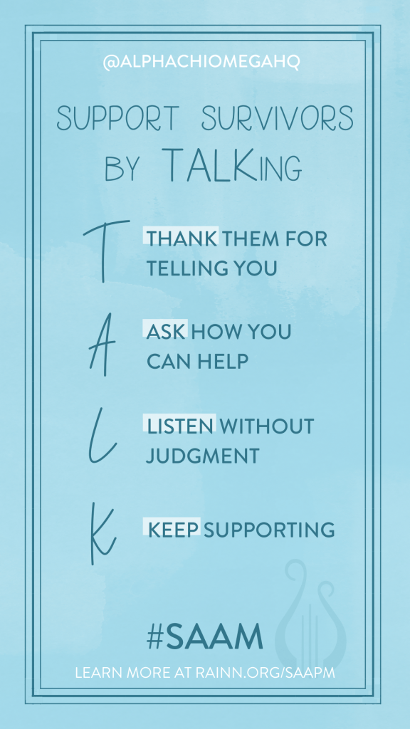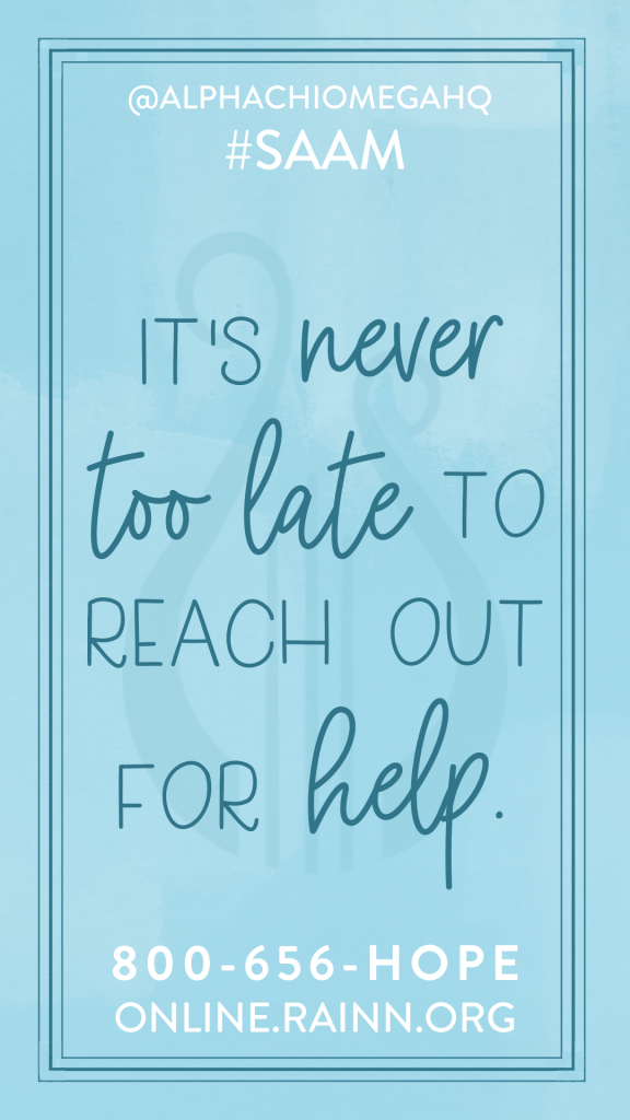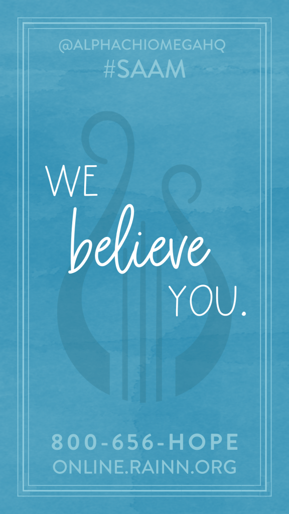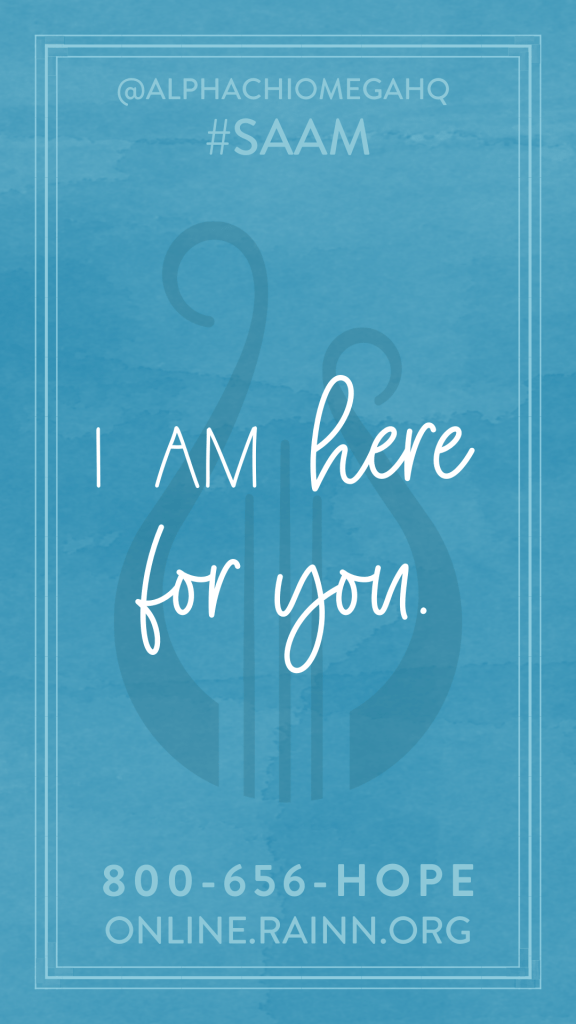 Alpha Chi Omega nationally is proud to be RAINN’s first national sorority partner. RAINN is the nation’s largest anti-sexual violence organization. RAINN created and operates the National Sexual Assault Hotline (800-656 HOPE, online.rainn.org , and rainn.org/es) and is a national leader in survivor support and advocacy. For those reading: Here are some ways you can get involved with RAINN and better support survivors in your community. Check out RAINN’s SAAM theme this year: Let’s Heal Together.