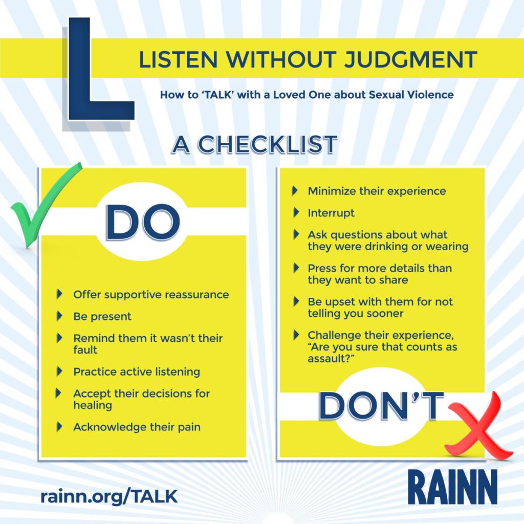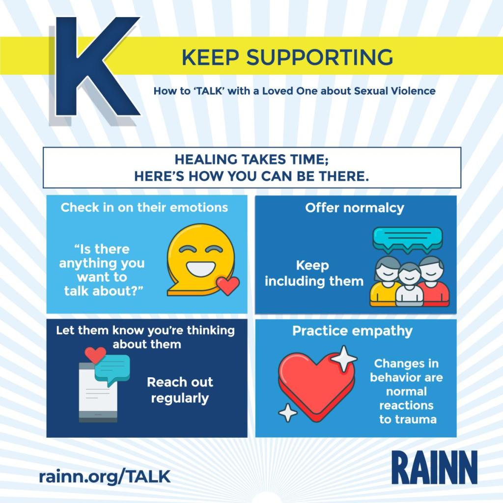 Often, people want to help survivors but might not know where to start. Whether someone in your life has disclosed a sexual assault to you or you just want to be prepared, take the time this month to learn about survivor response. We shared the above and below graphics to learn how to “TALK” about sexual violence. For those reading, we also want to share other resources available to help you navigate as you support the survivors in your life and in your community, as well. (we shared these on social and our internal forum, but we want everyone to have) You can utilize the National Sexual Assault Hotline (800-656-HOPE, online.rainn.org and rainn.org/es), which will connect you with a trained staff member from a sexual assault service provider in your area.