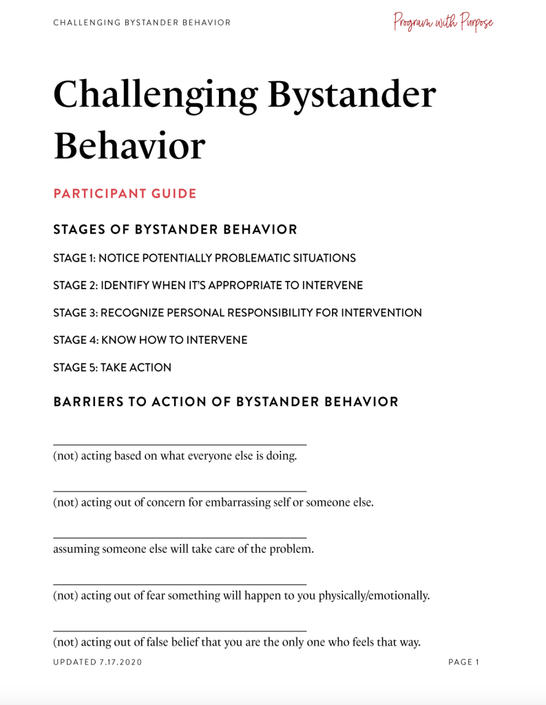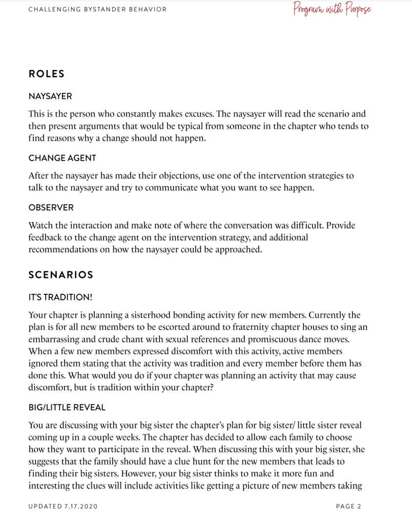 There are many ways to take action to eradicate sexual violence, and it all starts with prevention. The only person responsible for committing sexual assault is the perpetrator, but all of us can look out for each other’s safety. The chapter worked to facilitate a conversation about bystander intervention using Alpha Chi Omega’s Challenging Bystander Behavior Program with Purpose. (see the participant worksheets we utilized below)
