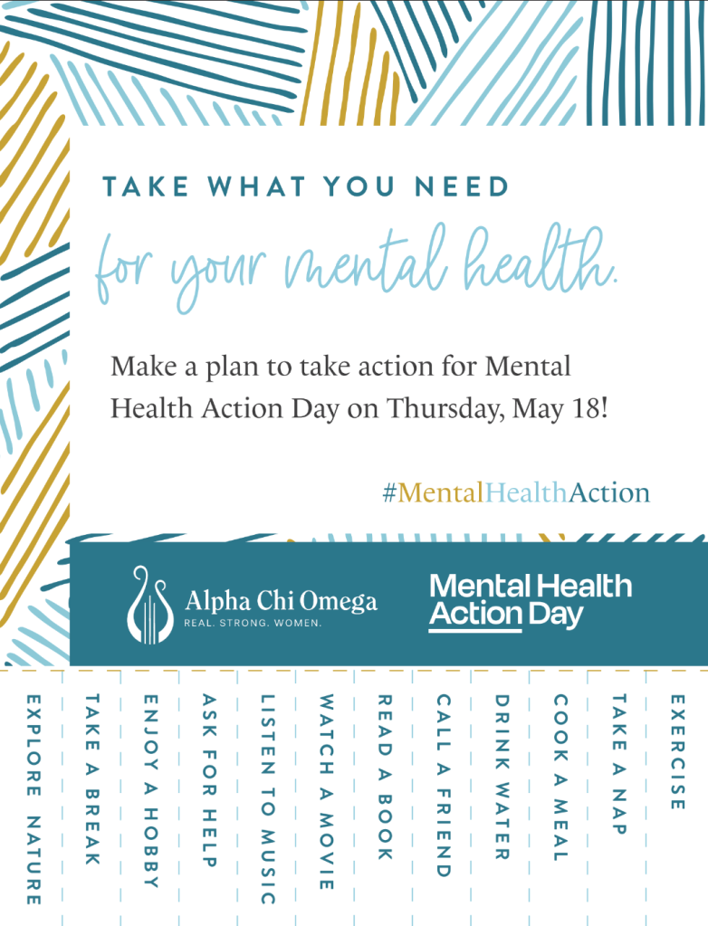 Mental Health Awareness Month (MHAM) is in May! Alpha Chi Omega is committed to providing educational resources and programming to promote a positive relationship with mental health for our members and within our chapter. Each week, members were encouraged to take steps to benefit their mental health and commit to taking action to improve it. By shifting from awareness to action, we can make mental health a priority for ourselves, our sisterhood and our community. Each week in May, we worked to share ideas for how to support sisters in taking action for their mental well-being around weekly mental health themes.