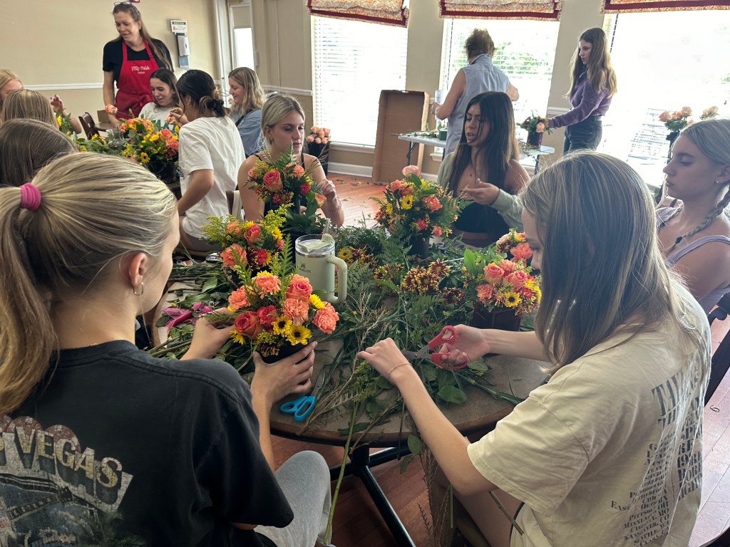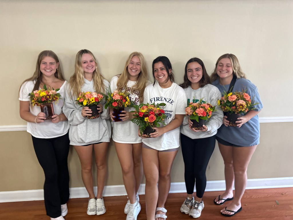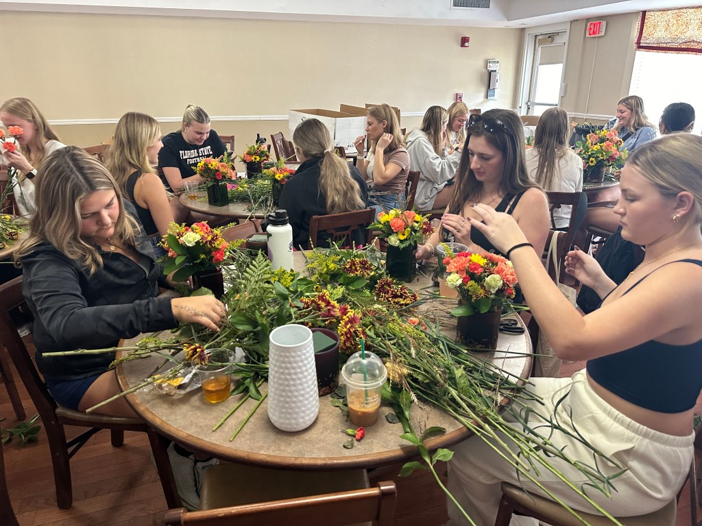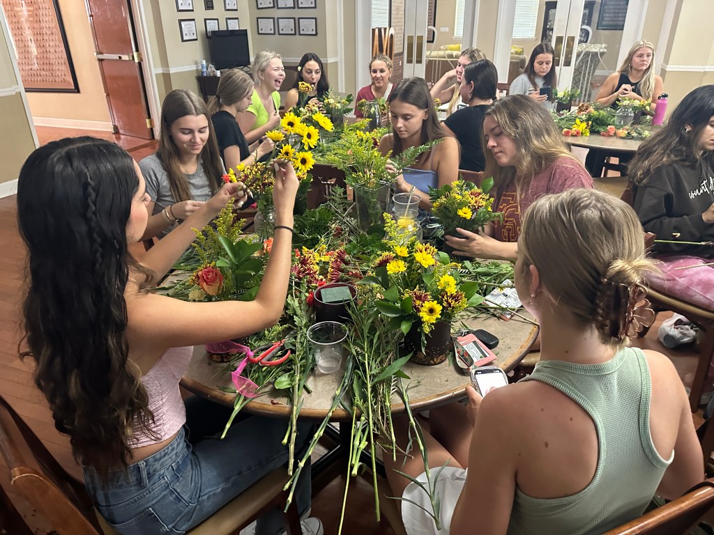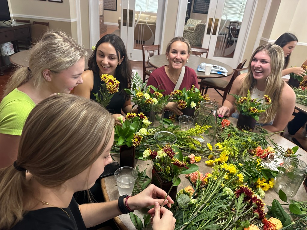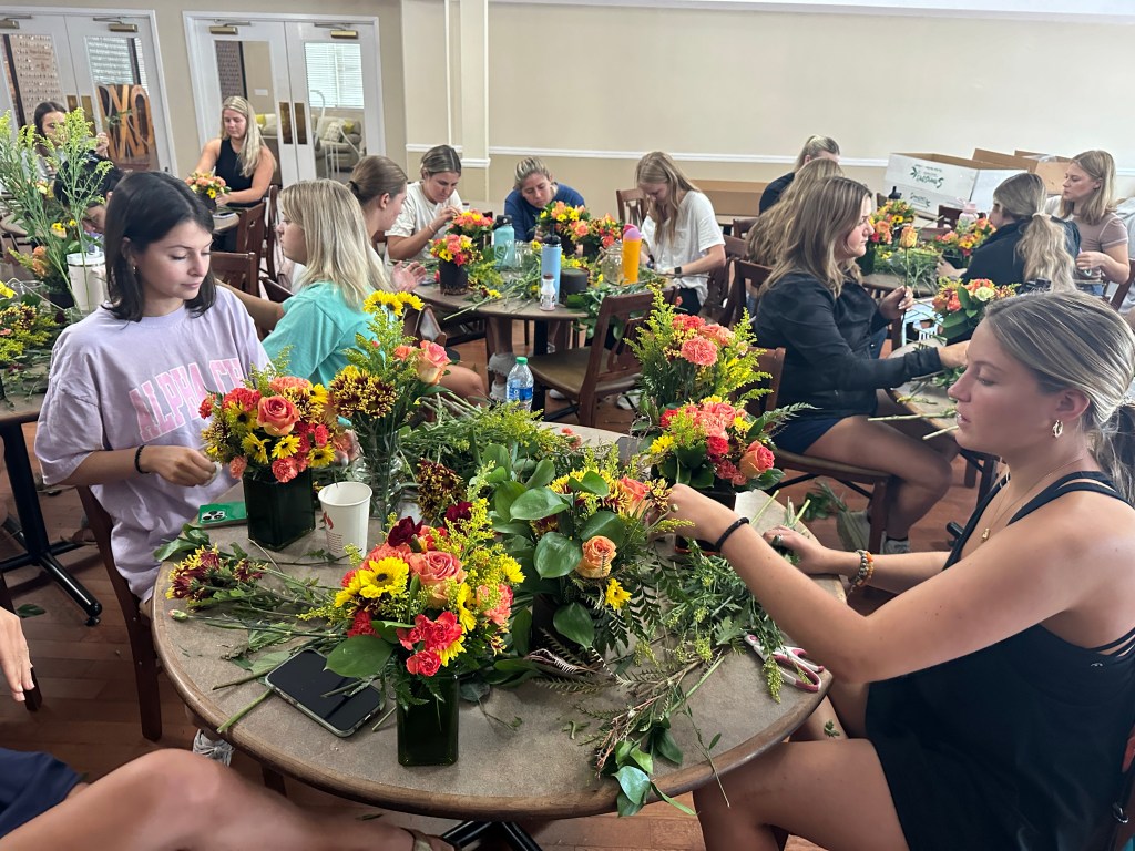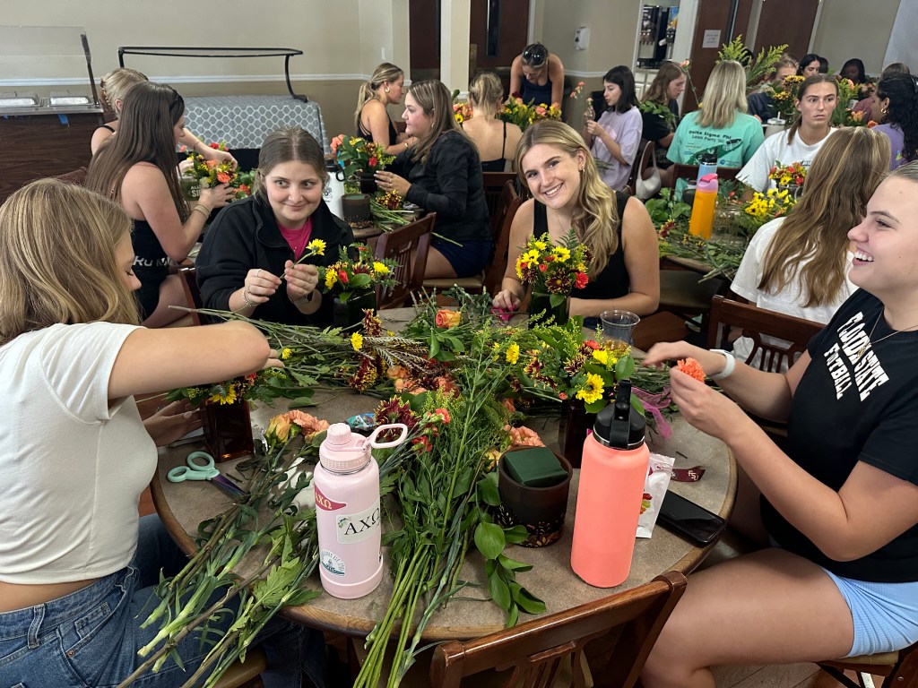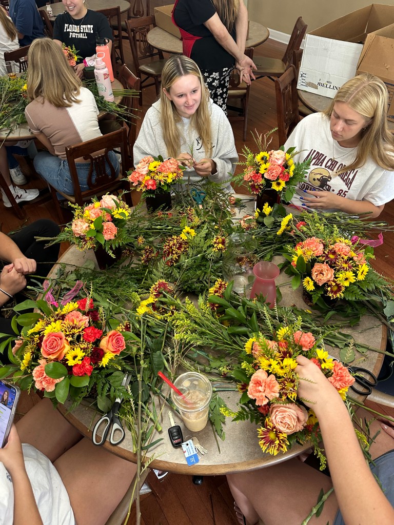 The ladies of Alpha Chi Omega kicked off the official fall season with a fall floral flower arranging class hosted by Hilley Fields. The amazing local florist has worked with the chapter for nearly 25+ years supplying flowers for initiation, recruitment, DVA gala, and more! When the VP of Programming, Emma K had an idea for a a flower arranging class, the ladies of Hilley Fields were happy to oblige. They shared the names of each plant/flower with the ladies while walking them step by step through how to build a beautiful fall arrangement that has height and depth! We think they all turned out great