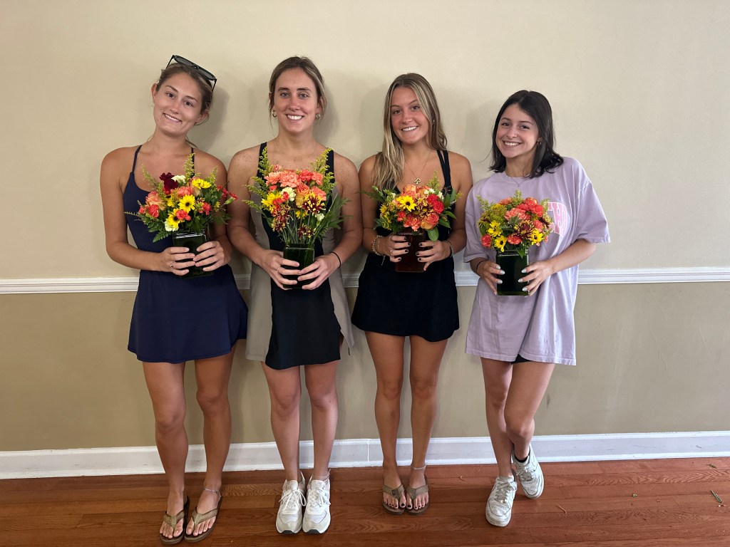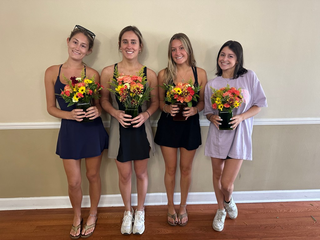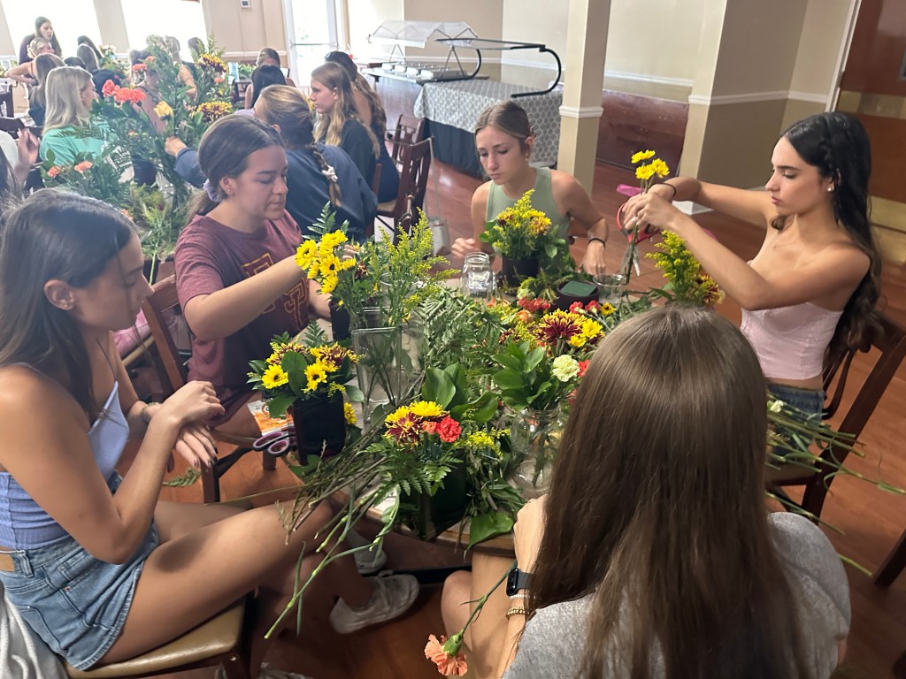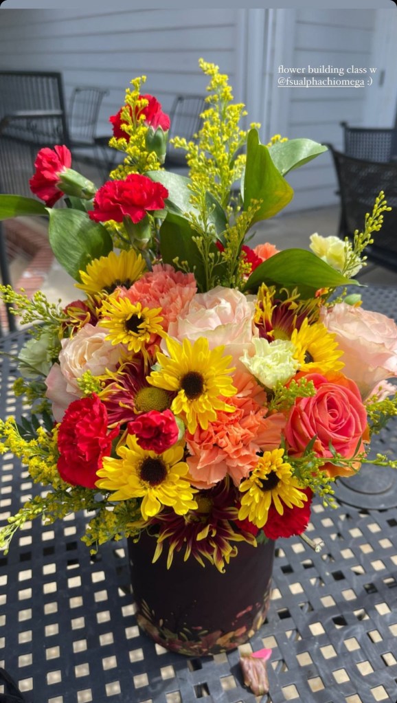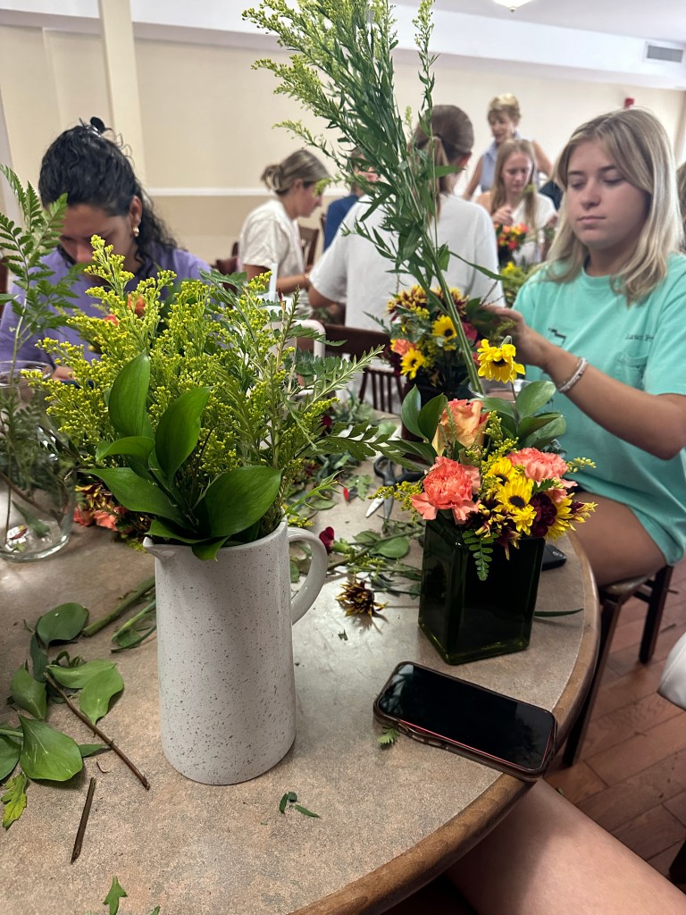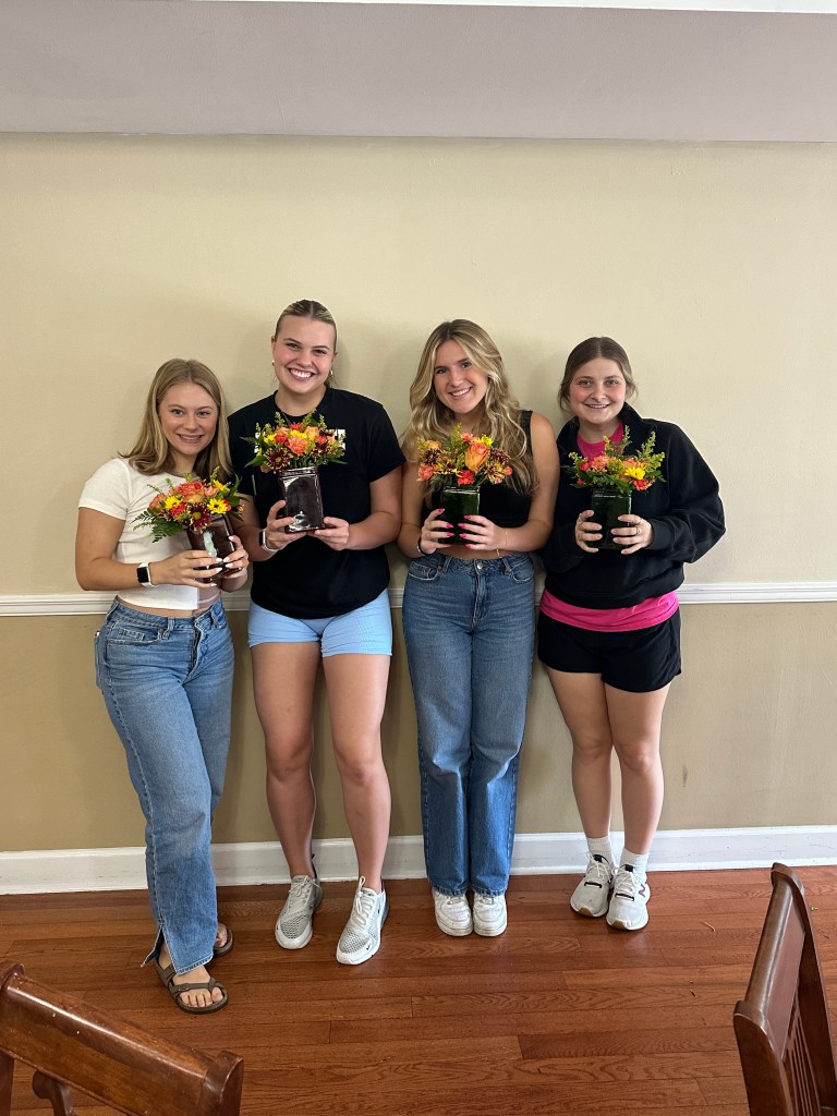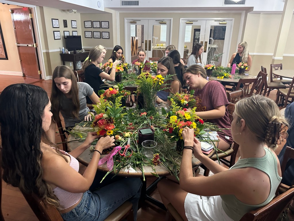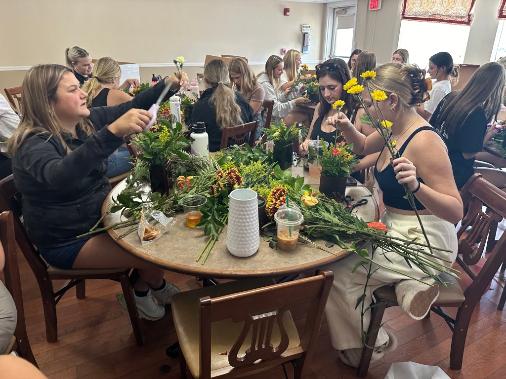 The ladies of Alpha Chi Omega kicked off the official fall season with a fall floral flower arranging class hosted by Hilley Fields. The amazing local florist has worked with the chapter for nearly 25+ years supplying flowers for initiation, recruitment, DVA gala, and more! When the VP of Programming, Emma K had an idea for a a flower arranging class, the ladies of Hilley Fields were happy to oblige. They shared the names of each plant/flower with the ladies while walking them step by step through how to build a beautiful fall arrangement that has height and depth! We think they all turned out great
