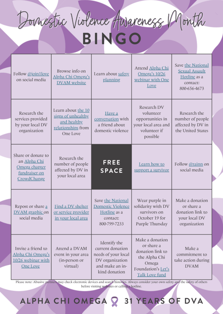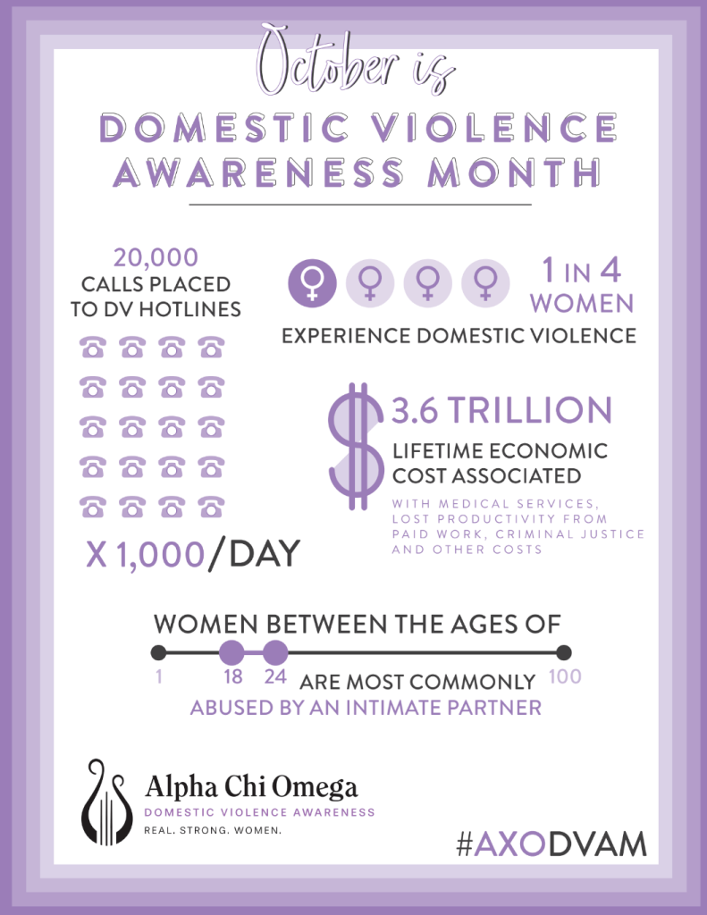 As we welcome another October, we also observe Domestic Violence Awareness Month (DVAM). Since its adoption in 1992, Alpha Chi Omega has shown continued commitment to this altruism. While we are devoted to this mission year-round, October serves as a reminder of the important impact our members can make.