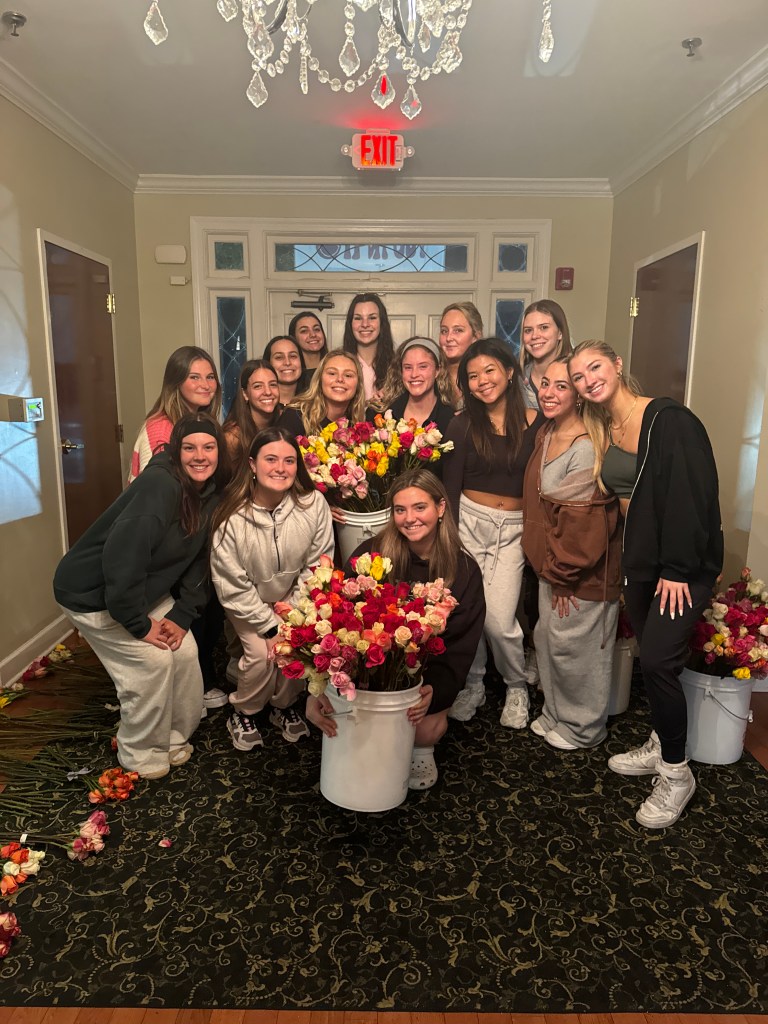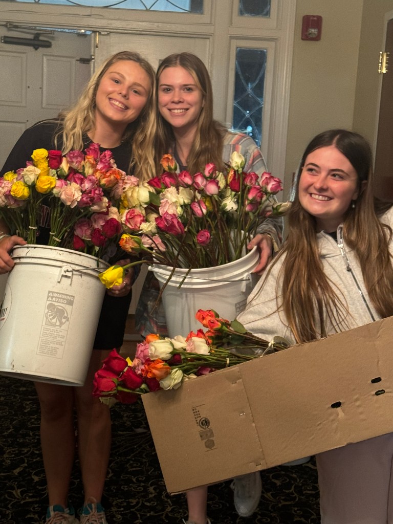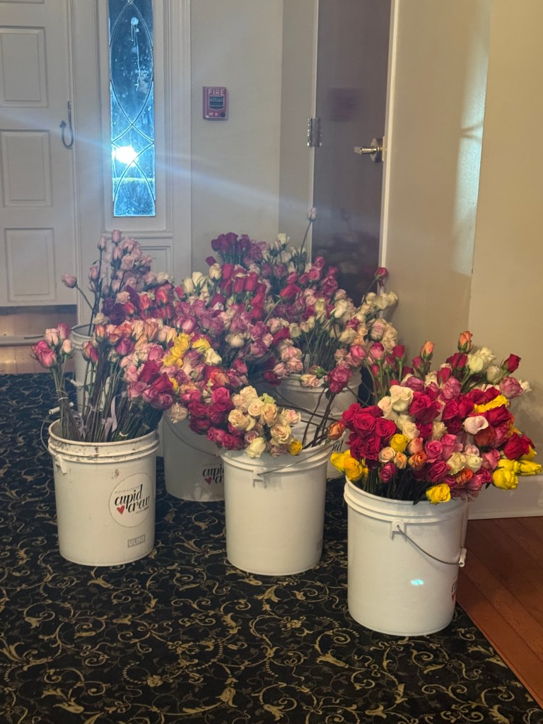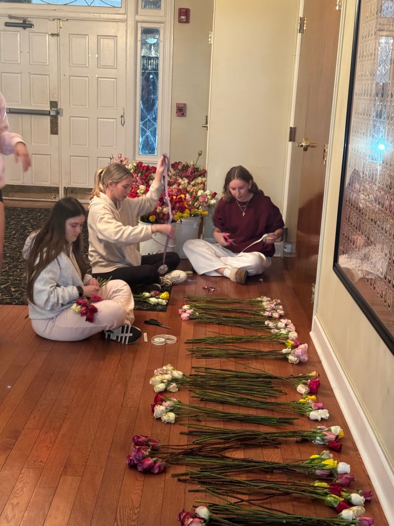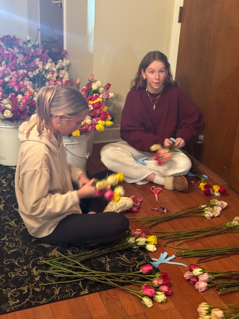 Then on February 13th sisters meet at the chapter facility to bundle nearly 2400+ roses into groupings for delivery the following day.. Fun fact: Cupid Crew volunteers throughout the country have delivered 750,000 cards and roses to older adults at risk of feeling isolated, including many living in nursing homes and assisted living facilities.