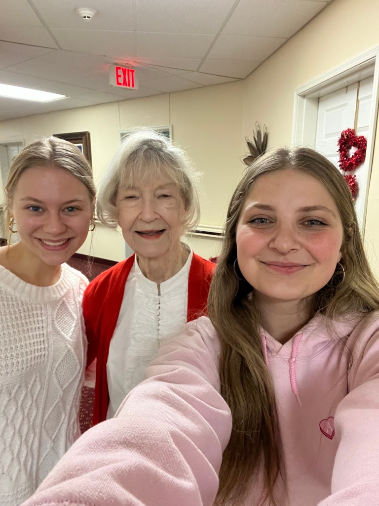 Fun fact, sisters Keirsten, Samantha, Bella, Mallory, and Lily ran into Beta Eta Alumnae Hellen Martin Conger who was initiated in 1951 while delivering cards/flowers so of course they had to snap a photo!