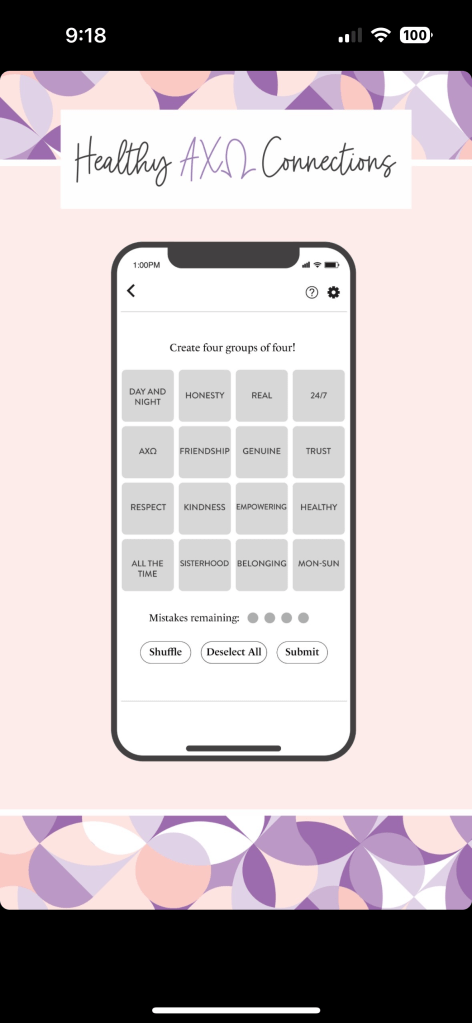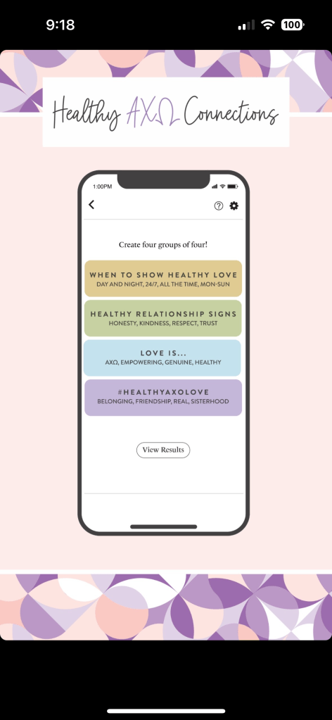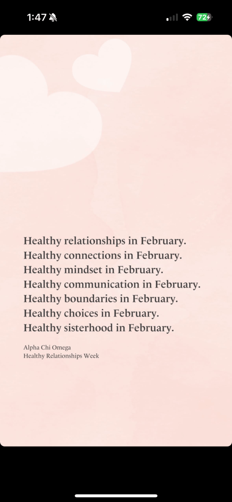 This year, Alpha Chi Omega explored how healthy connections create a sense of belonging, support, and understanding, which help to strengthen relationships around us. We urged participants to consider how they can contribute to building strong, positive relationships and friendships in their life, and to check out the opportunities to celebrate healthy love this February!
