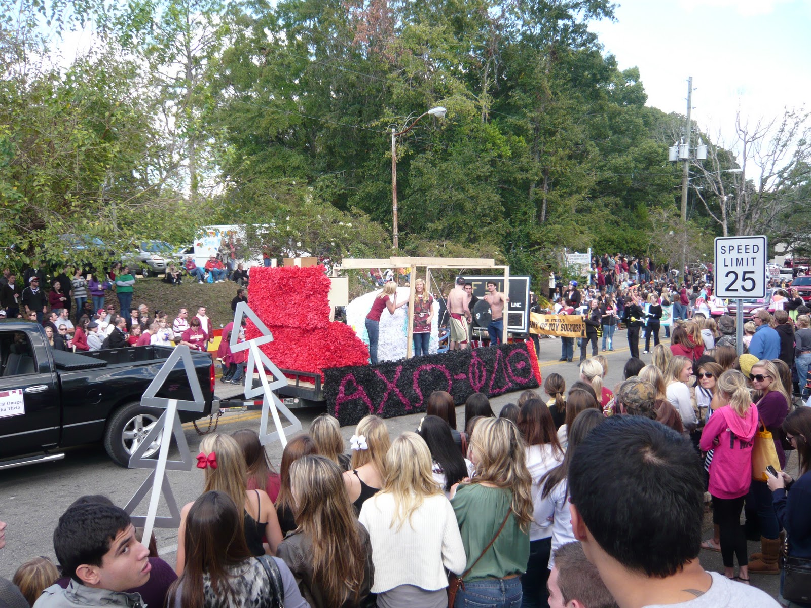 We will always met at the chapter house and walk to College Avenue to view the Homecoming parade and cheer on our Alpha Chi Omega sisters! The collegiate members of Alpha Chi Omega pair with a greek organization and a registered student organization for Homecoming and we cheer them on as their float passes.